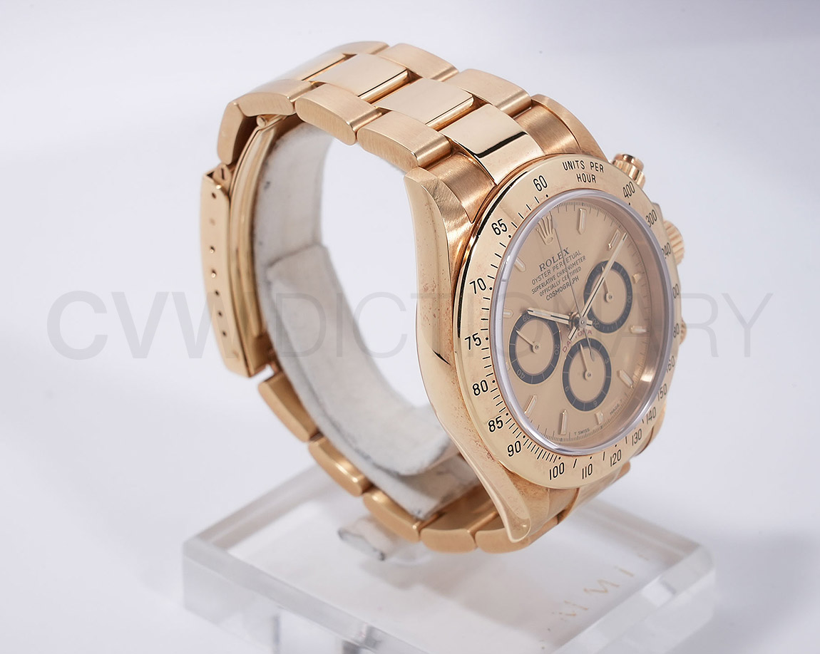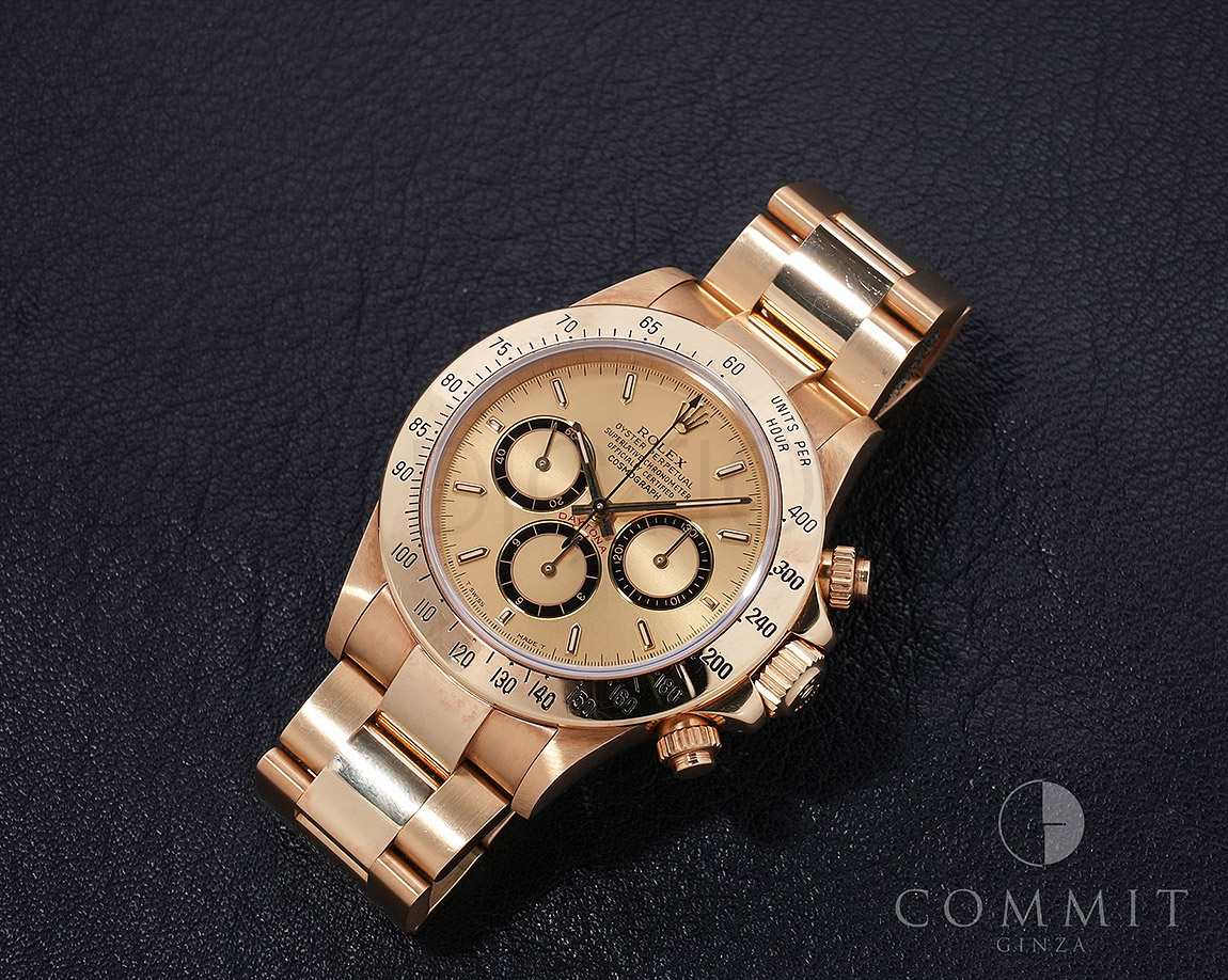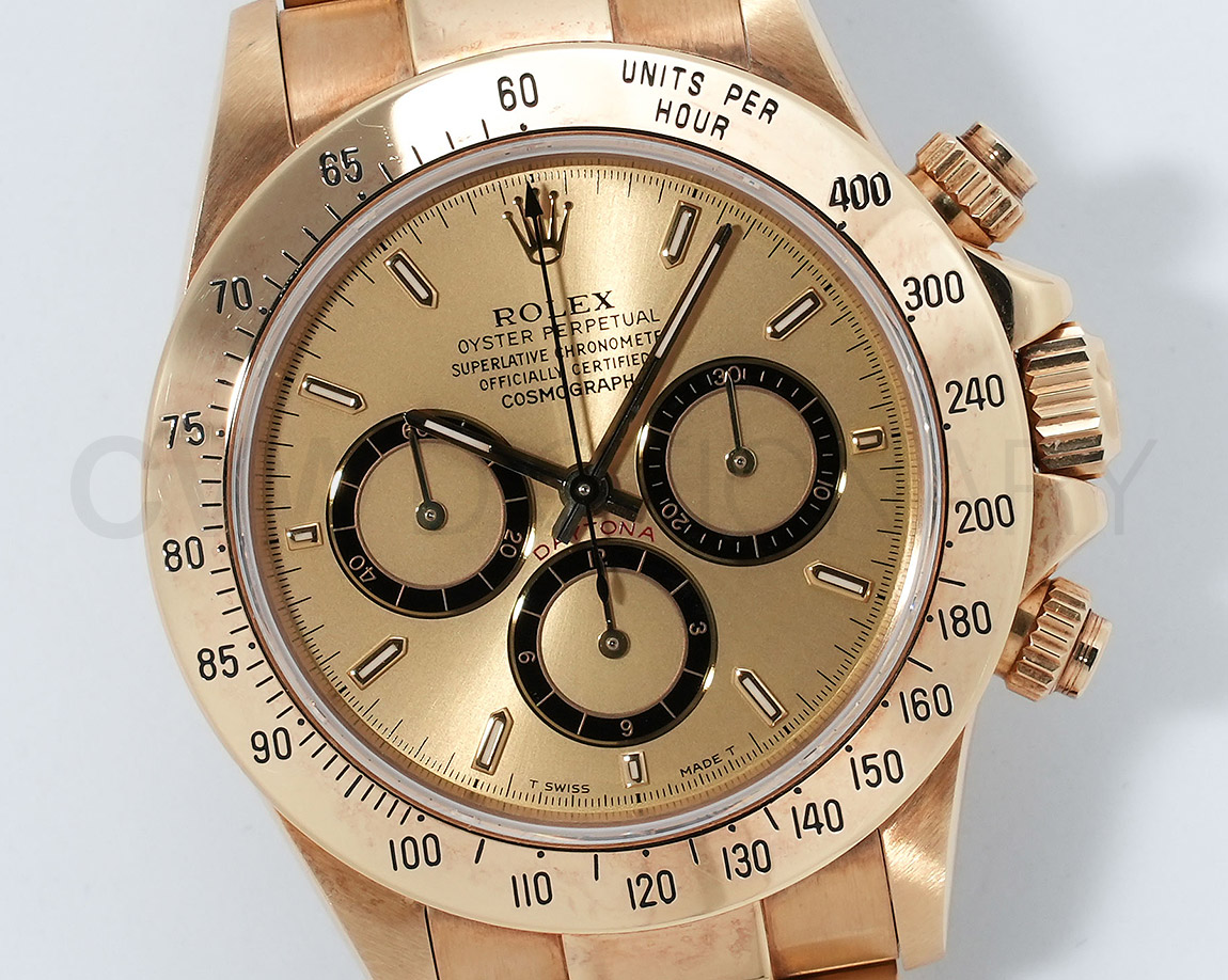 ドライヴィングとスピードに情熱を捧げる人々の究極の実用時計「コスモグラフ デイトナ」は、プロのカーレーサーのニーズに応えるよう設計され、1963年に誕生しました。こちらは金無垢ケースにシャンパンゴールド文字盤を組み合わせた高級感ある一本です。
