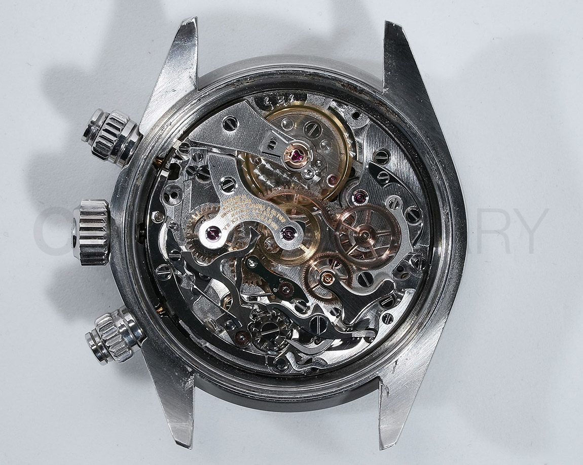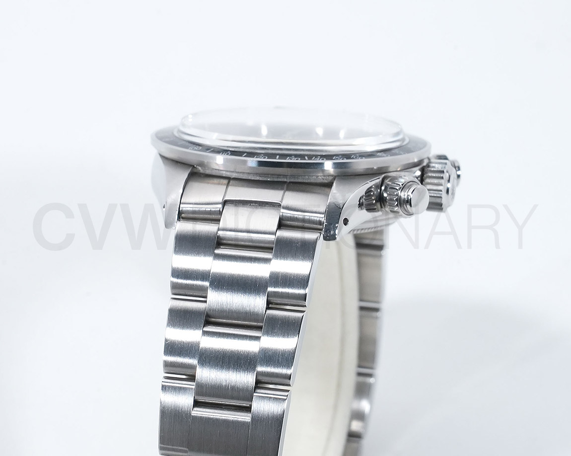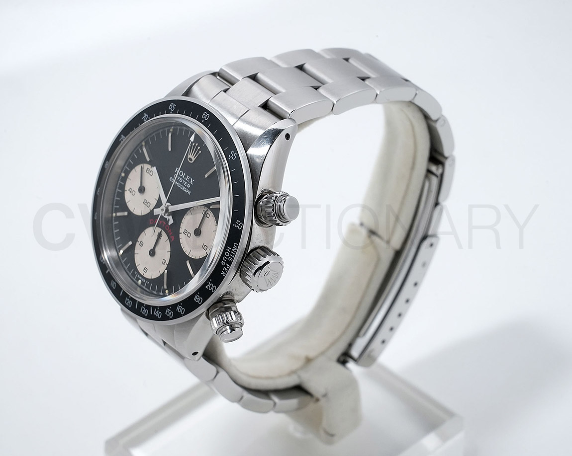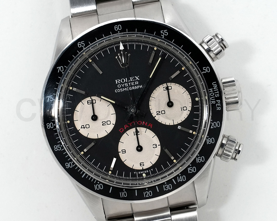 1971年頃より登場し、デイトナ第3世代となるのがこちらの「Ref.6265」で、プッシュボタンがねじ込みスクリューに、防水性は30mから50mへとスペックアップしており、手巻きクロノグラフムーブの完成型Cal.727が搭載されています。