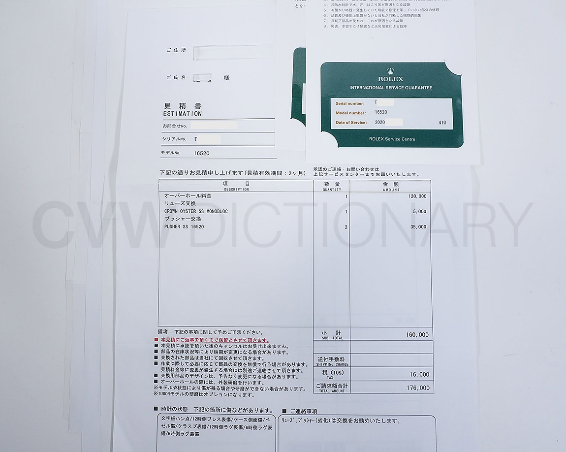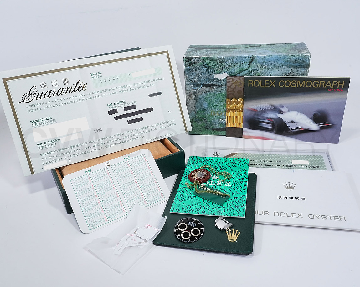 付属品も保証書、デイトナ冊子(1997)、カレンダー(1997-1998)ブラック文字盤・針一式(ルミノバ夜光)など充実しております。