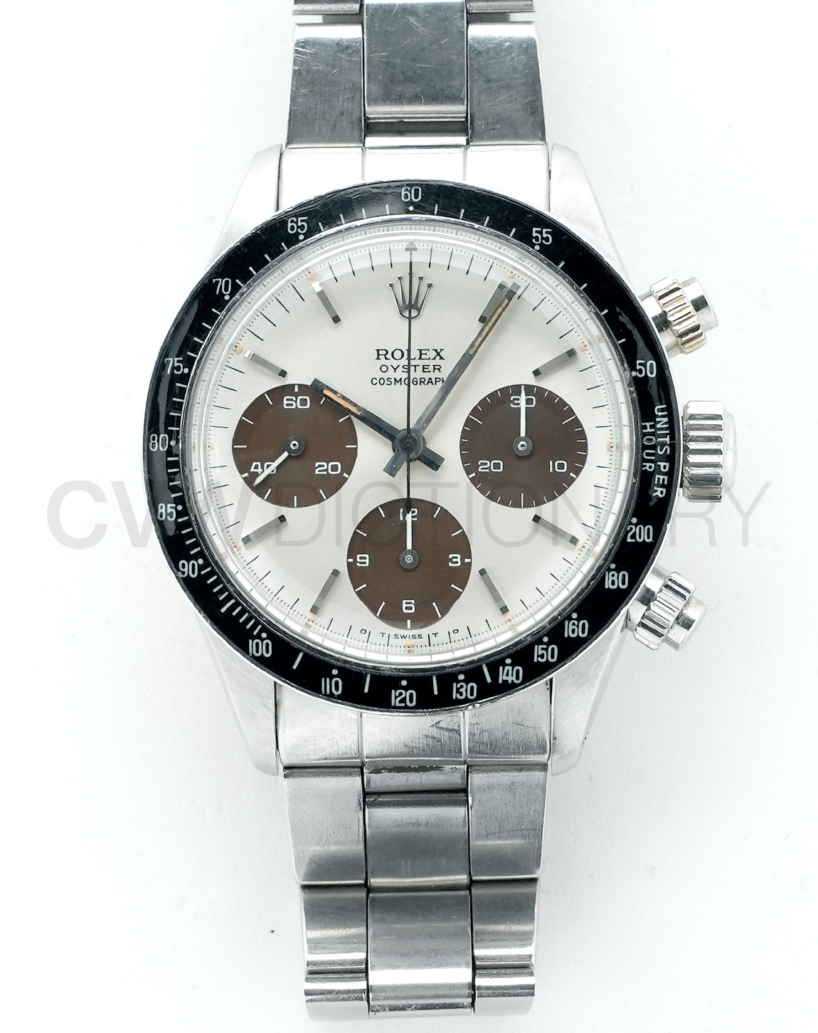 こちらの手巻デイトナは、人気の「Ref.6263」初期Mark.1ダイヤル且つ、通好みの”DAYTONA”表記なしモデルです。メーカーでの過去のサービス時に、ベゼルとプッシャーが交換されており、針・インデックスの夜光も修復がされています。フラッシュフィット357、巻きブレス7835(クラスプ刻印 4 72)が付いてます。ケースは年代を考慮するとしっかりとしており、文字盤、ベゼルのコンディションは良好です。