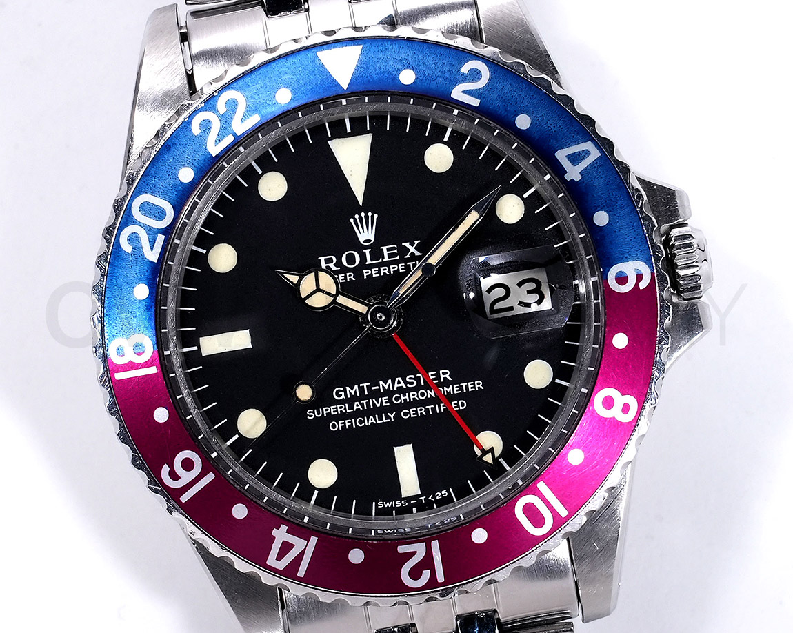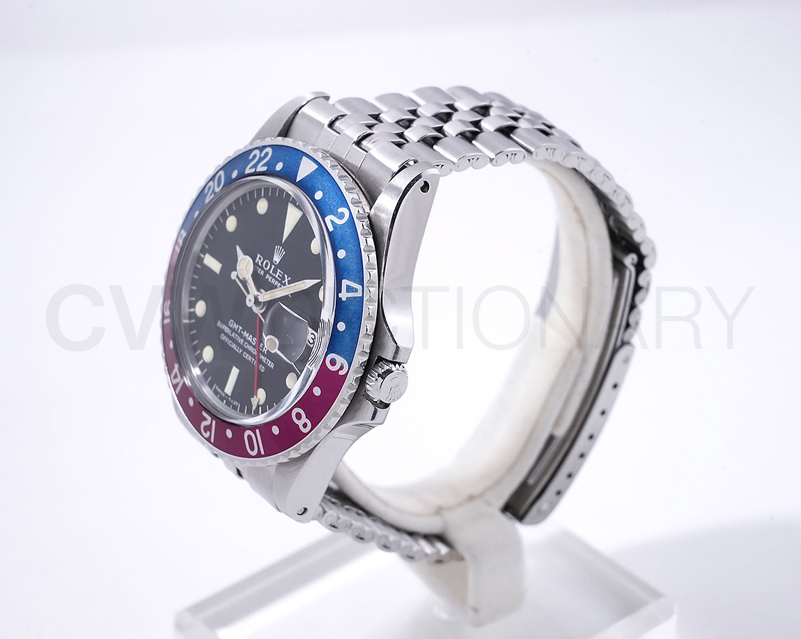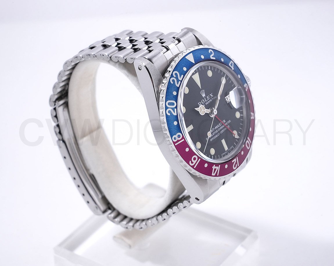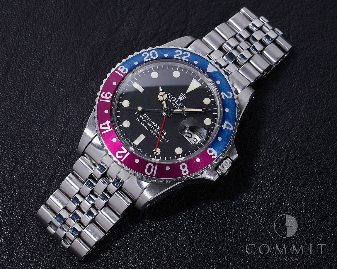 1960年から1980年頃まで製造されたロングセラーモデルのGMTマスター「Ref.1675」。フチなしのインデックスにプラスチック風防を備え、アンティークの雰囲気を存分に楽しむことができるモデルです。