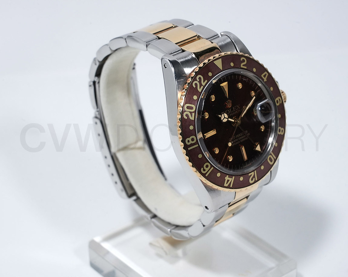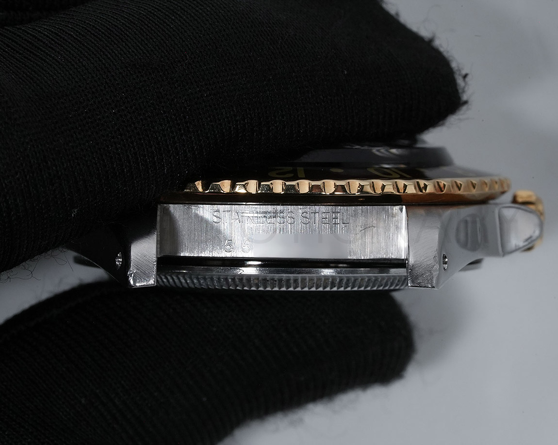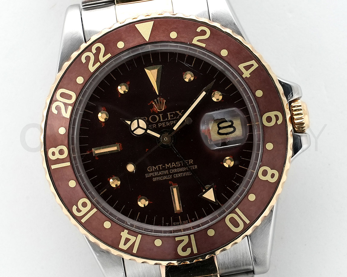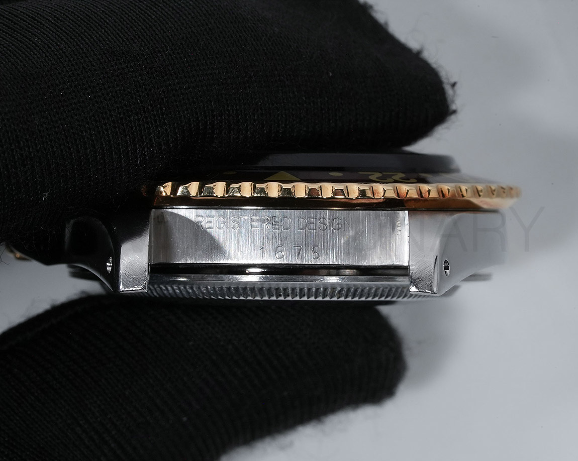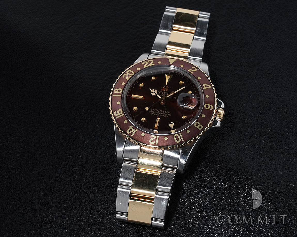 1960年代後半から追加された『GMTマスター』初のSS/YGのコンビモデル「Ref.1675/3」。プラスチック風防を備え、インデックスがアップライト仕様で人気の通称「フジツボダイヤル」が採用されています。アンティークの雰囲気を存分に楽しむことができるモデルです。