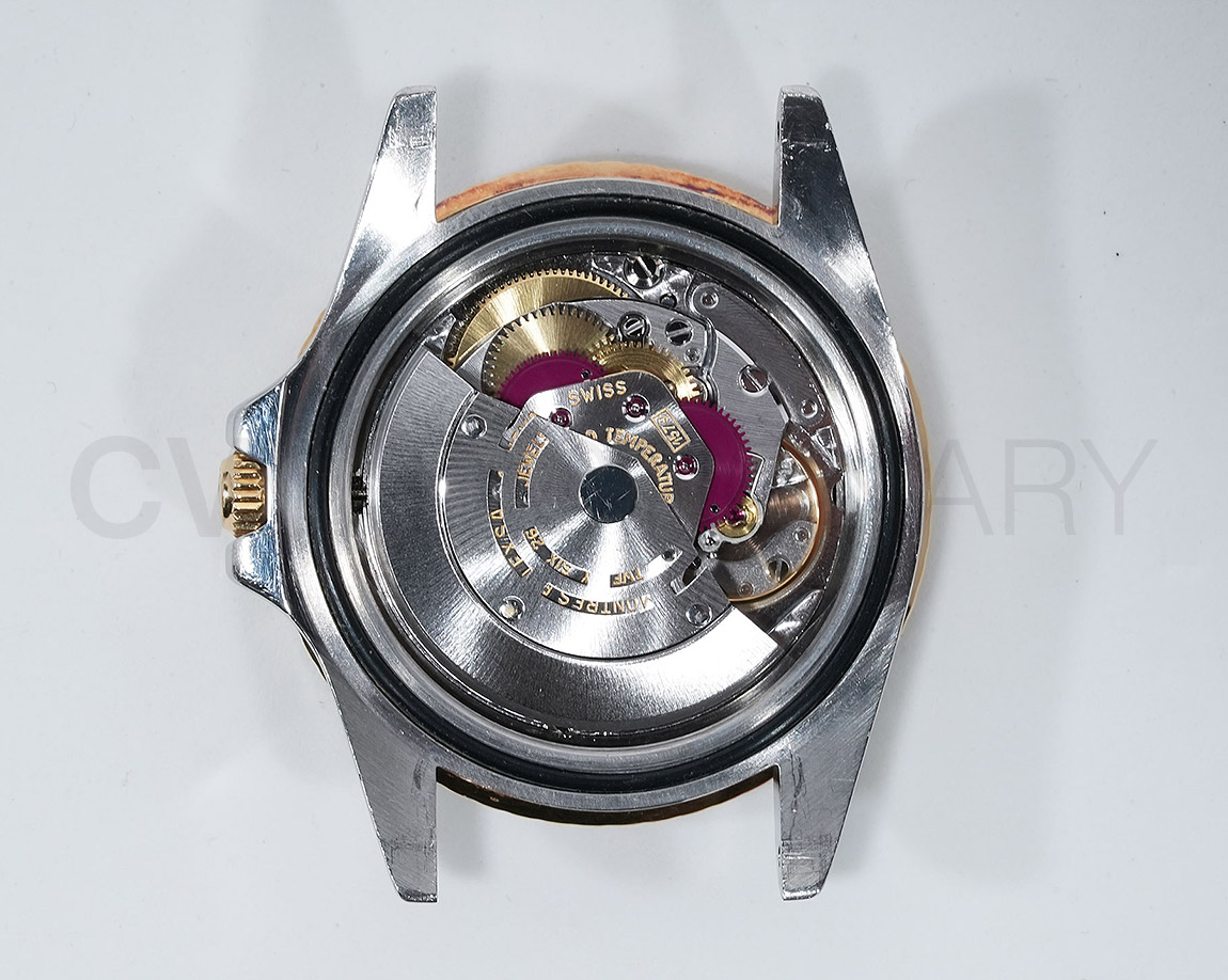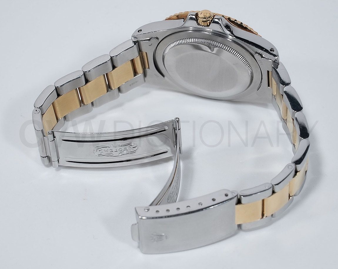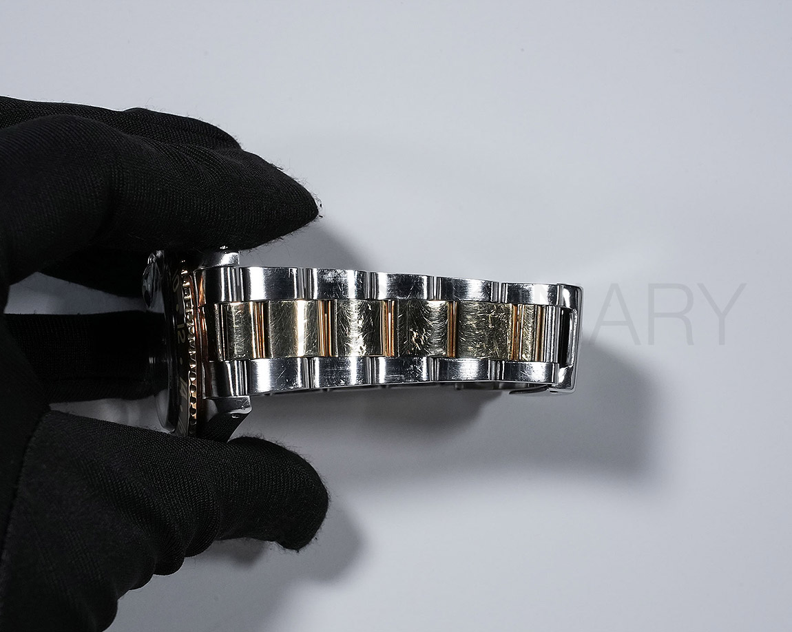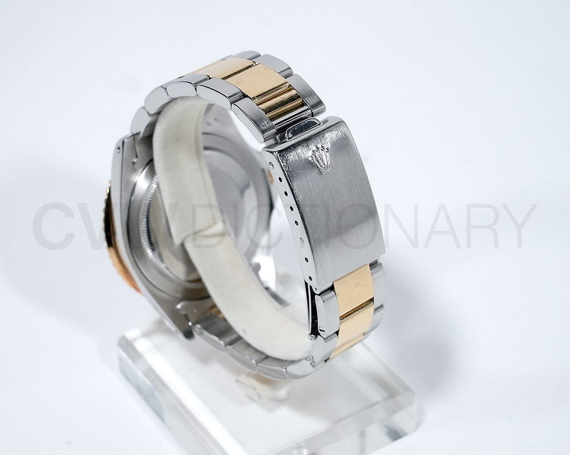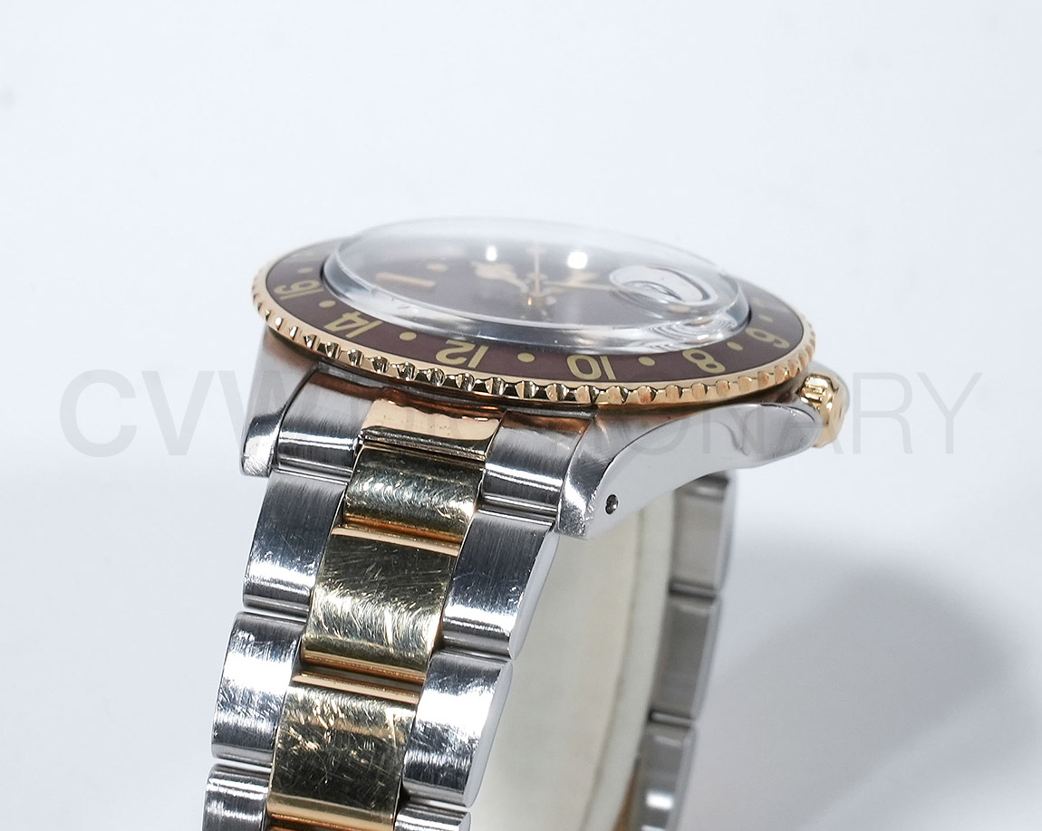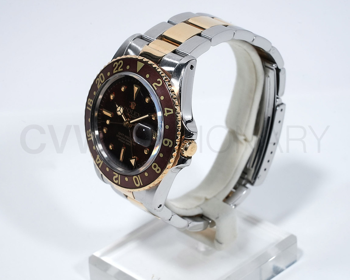 1960年代後半から追加された『GMTマスター』初のSS/YGのコンビモデル「Ref.1675/3」。プラスチック風防を備え、インデックスがアップライト仕様で人気の通称「フジツボダイヤル」が採用されています。アンティークの雰囲気を存分に楽しむことができるモデルです。