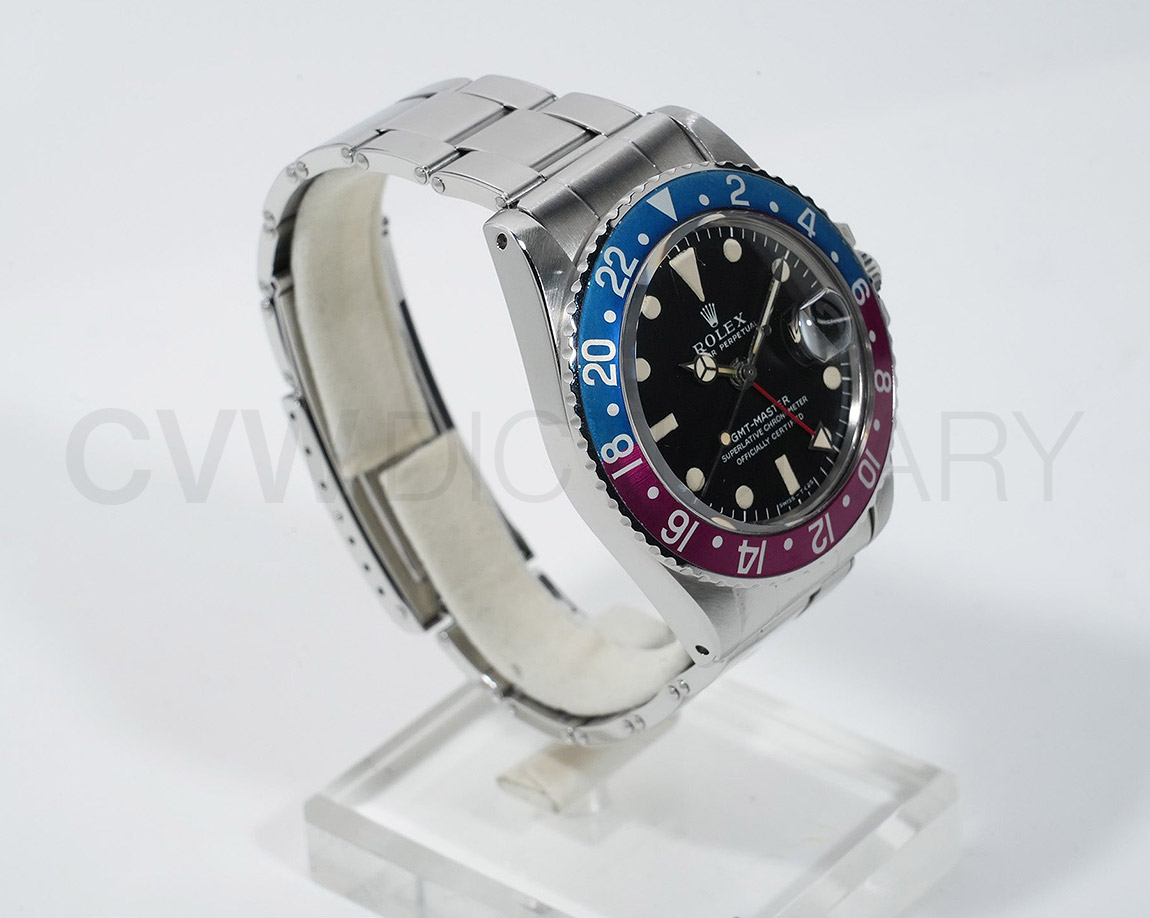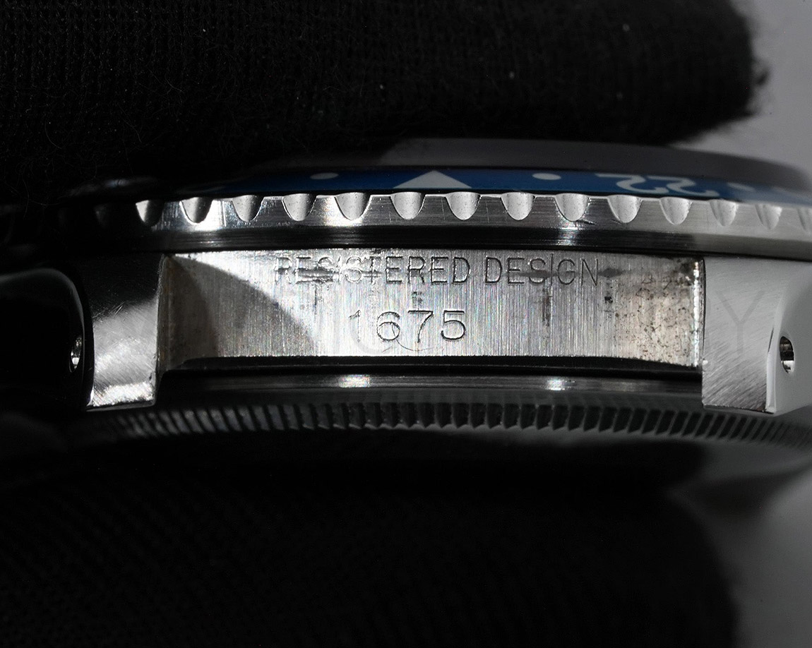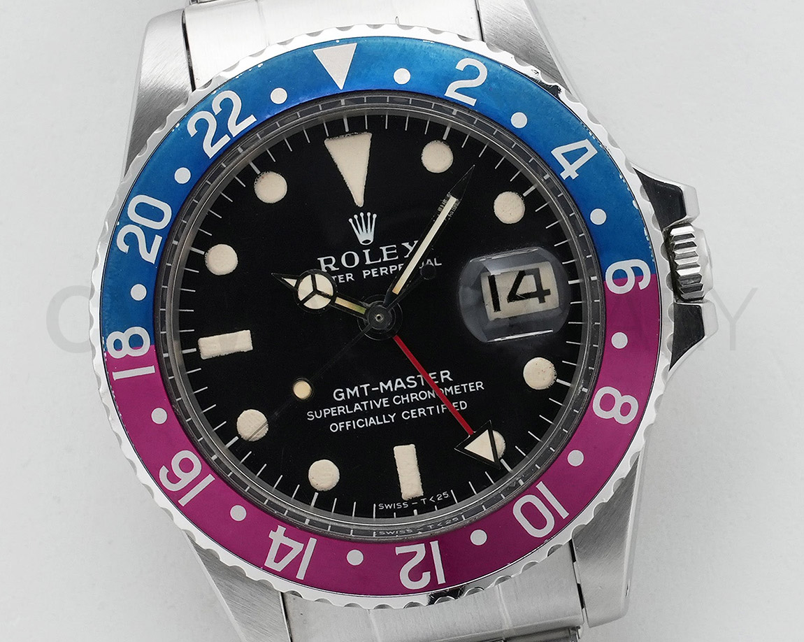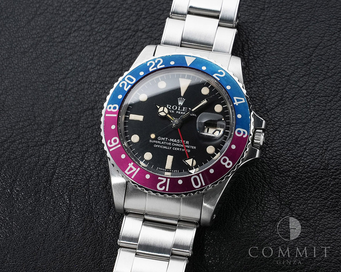 1960年から1980年頃まで製造されたロングセラーモデルのGMTマスター「Ref.1675」。フチなしのインデックスにプラスチック風防を備え、アンティークの雰囲気を存分に楽しむことができるモデルです。