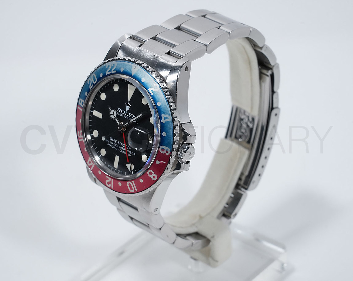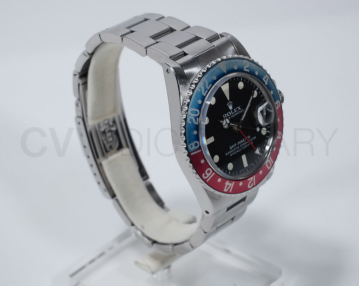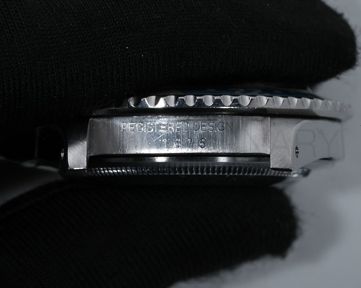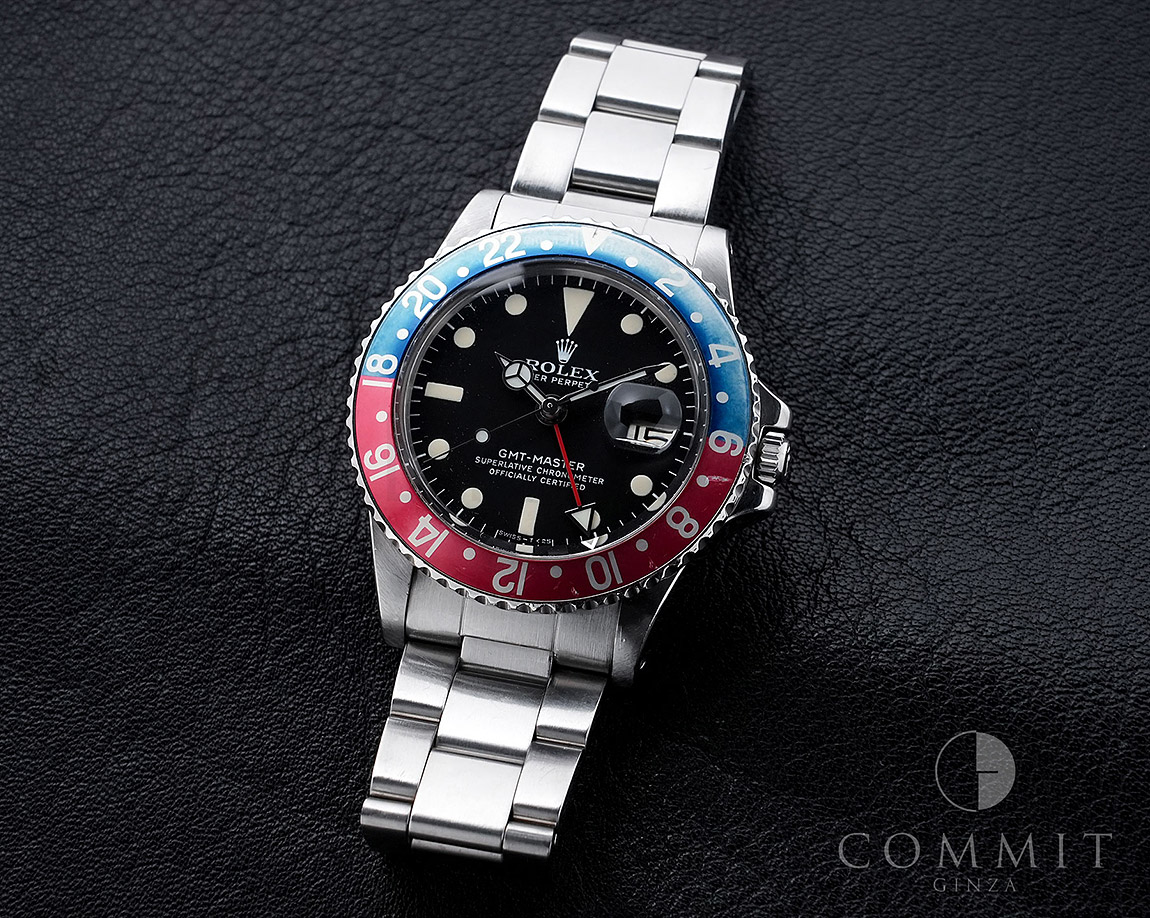 1960年から1980年頃まで製造されたロングセラーモデルのGMTマスター「Ref.1675」。フチなしのインデックスにプラスチック風防を備え、アンティークの雰囲気を存分に楽しむことができるモデルです。