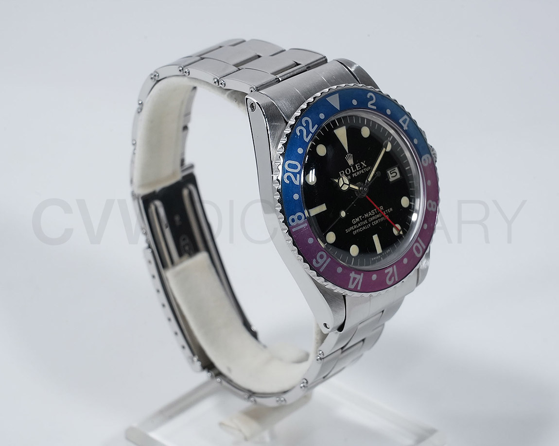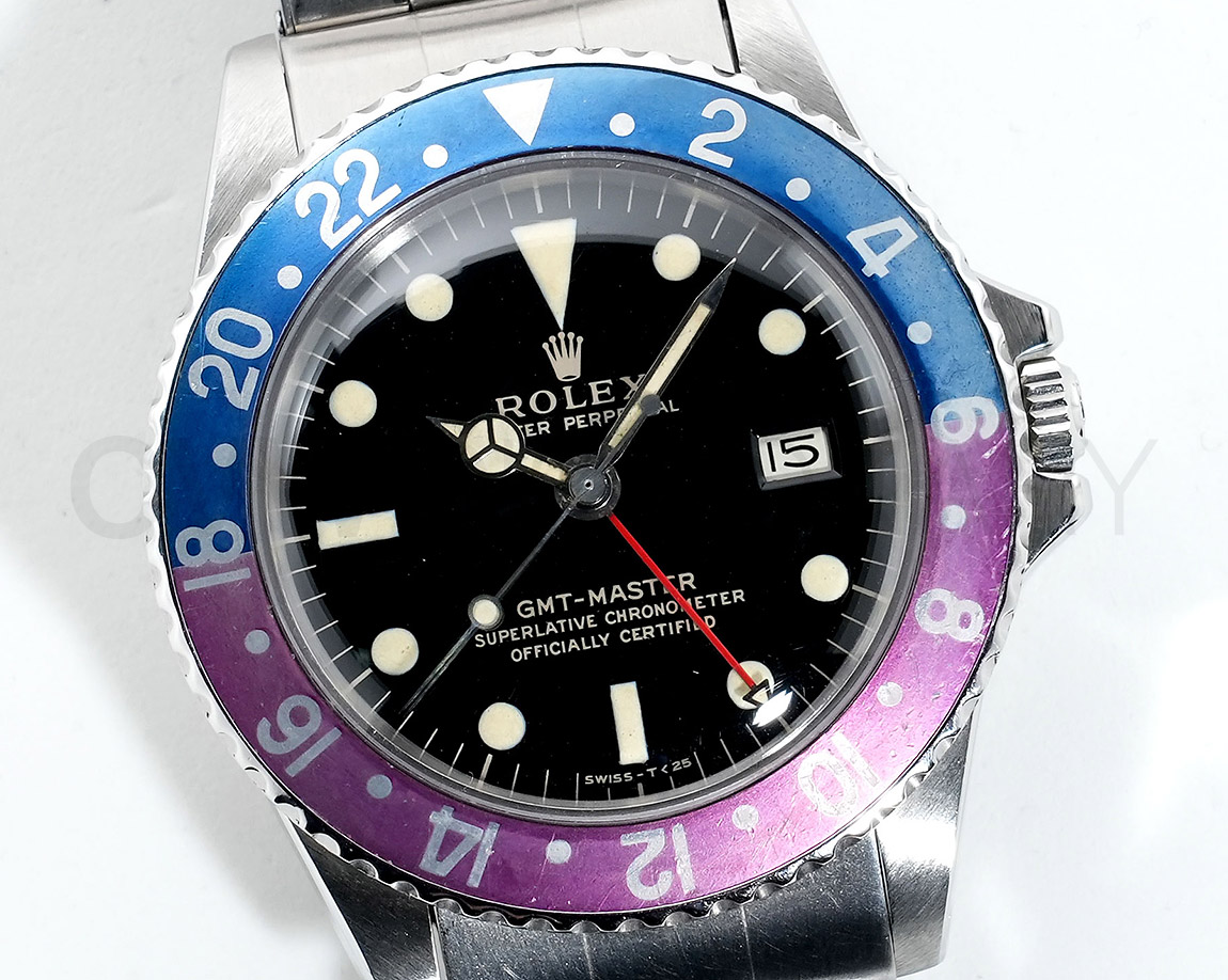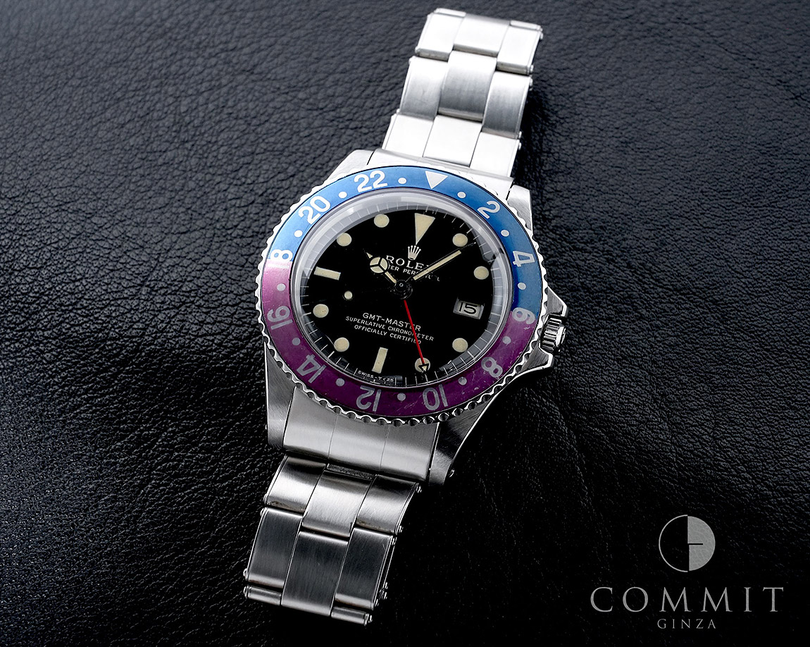 1960年から1980年頃まで製造されたロングセラーモデルのGMTマスター「Ref.1675」。フチなしのインデックスにプラスチック風防を備え、アンティークの雰囲気を存分に楽しむことができるモデルです。