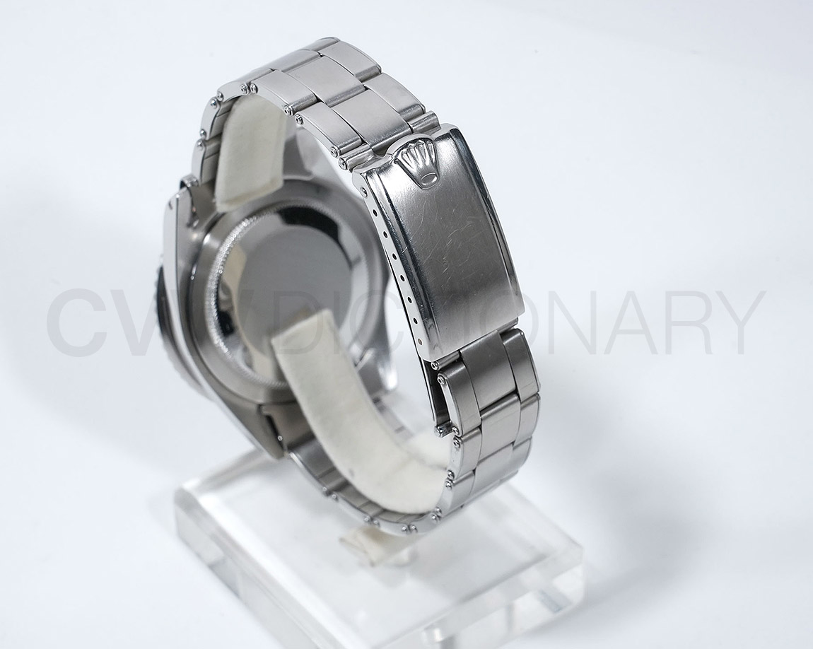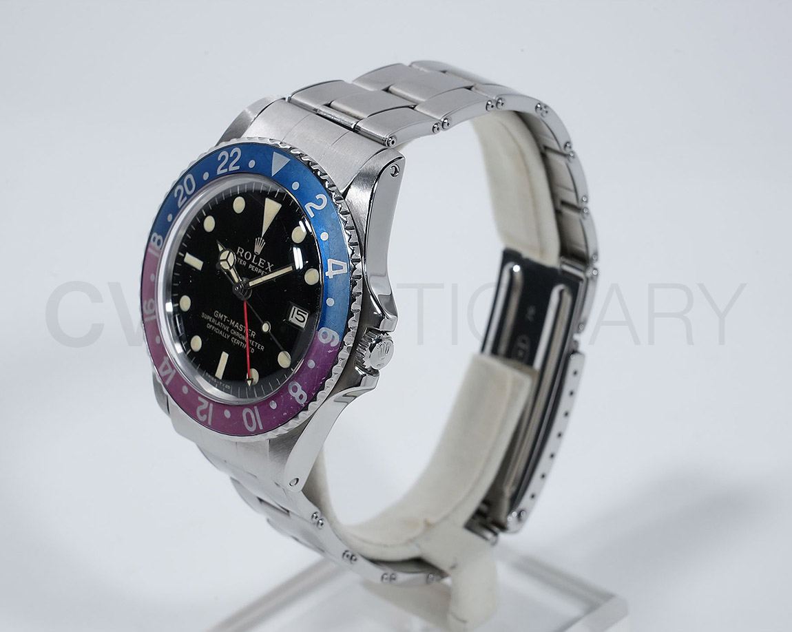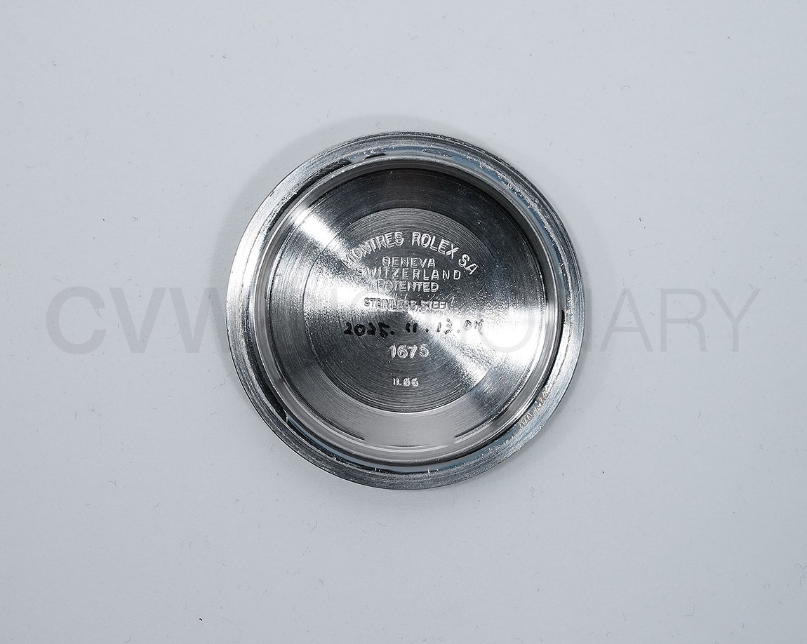 1960年から1980年頃まで製造されたロングセラーモデルのGMTマスター「Ref.1675」。フチなしのインデックスにプラスチック風防を備え、アンティークの雰囲気を存分に楽しむことができるモデルです。