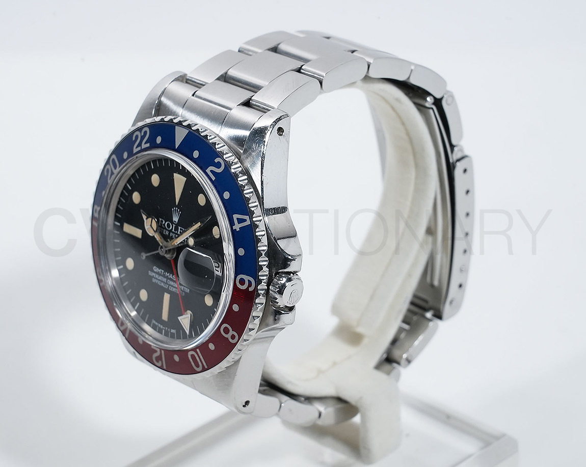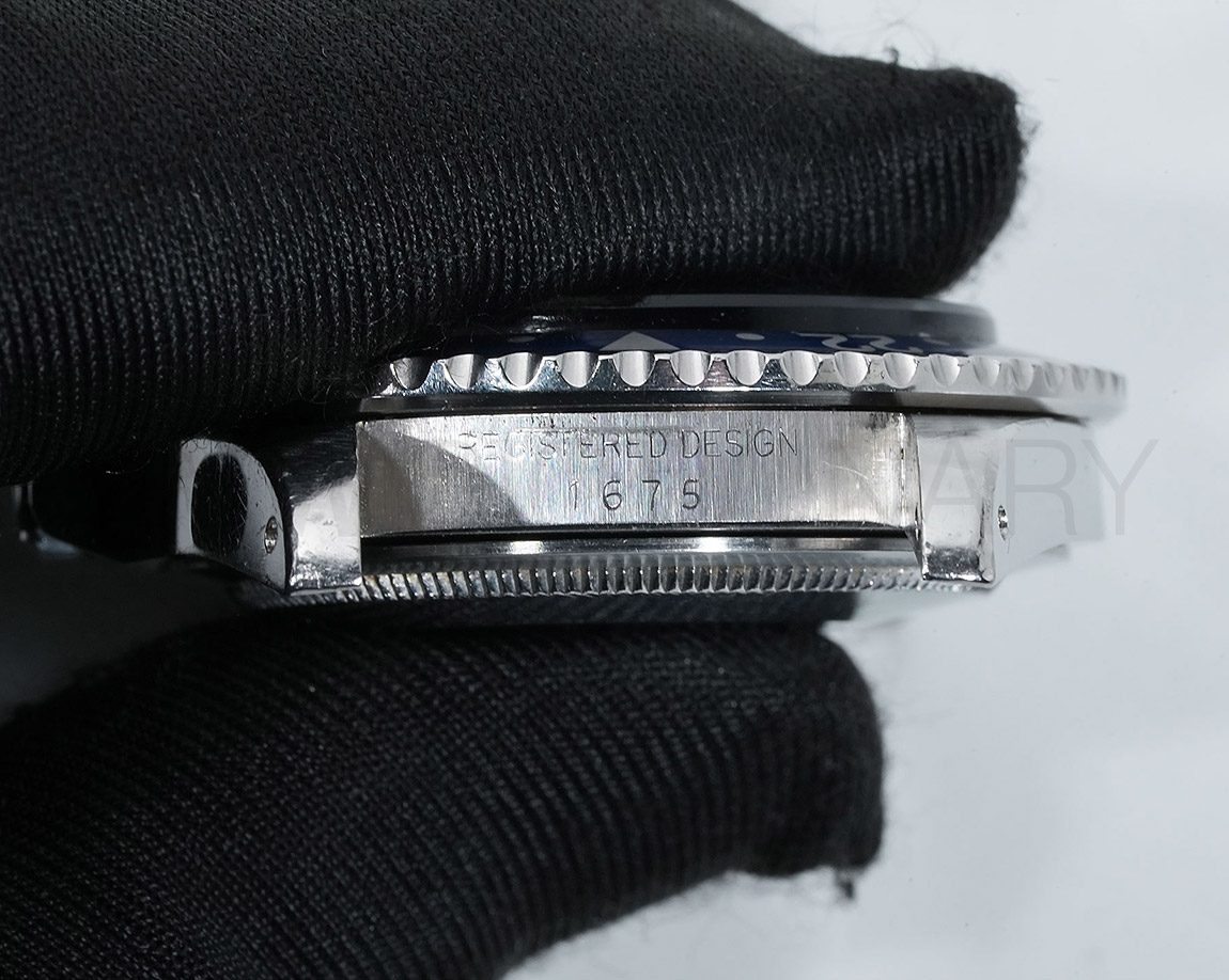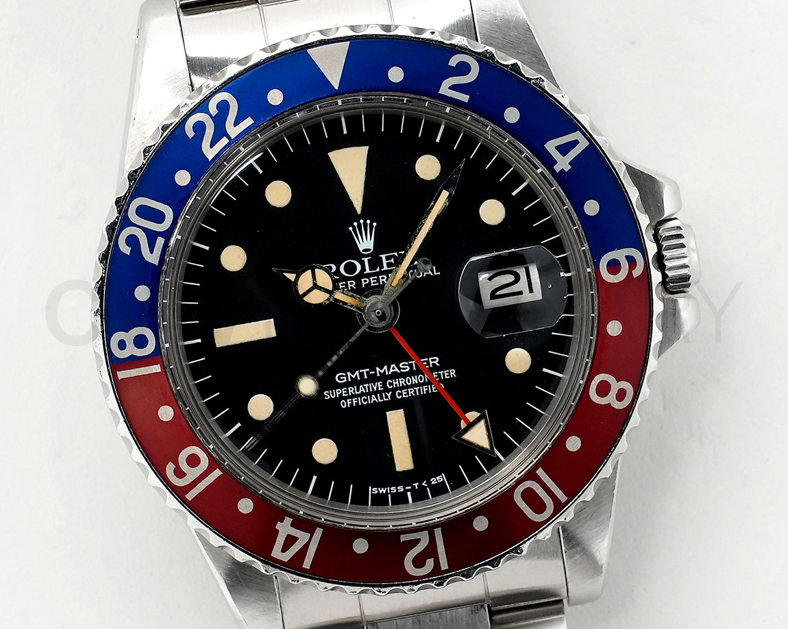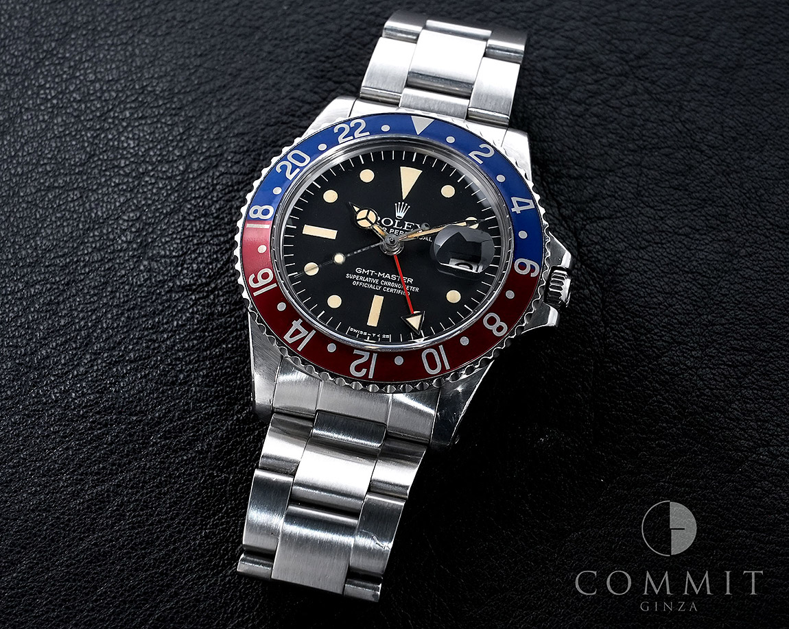 1960年から1980年頃まで製造されたロングセラーモデルのGMTマスター「Ref.1675」。フチなしのインデックスにプラスチック風防を備え、アンティークの雰囲気を存分に楽しむことができるモデルです。