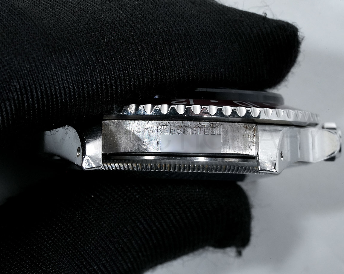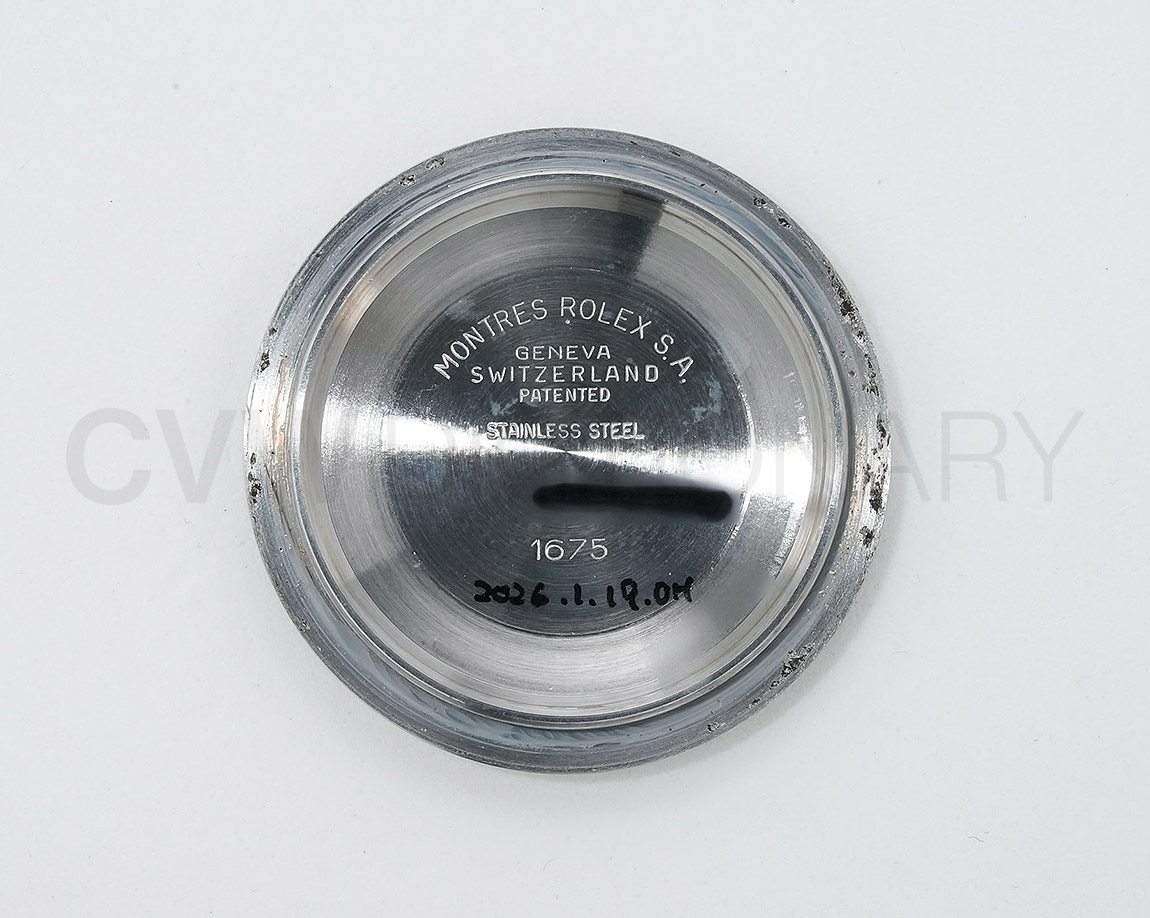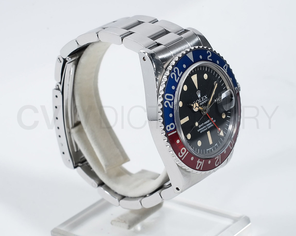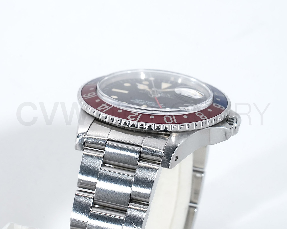 1960年から1980年頃まで製造されたロングセラーモデルのGMTマスター「Ref.1675」。フチなしのインデックスにプラスチック風防を備え、アンティークの雰囲気を存分に楽しむことができるモデルです。