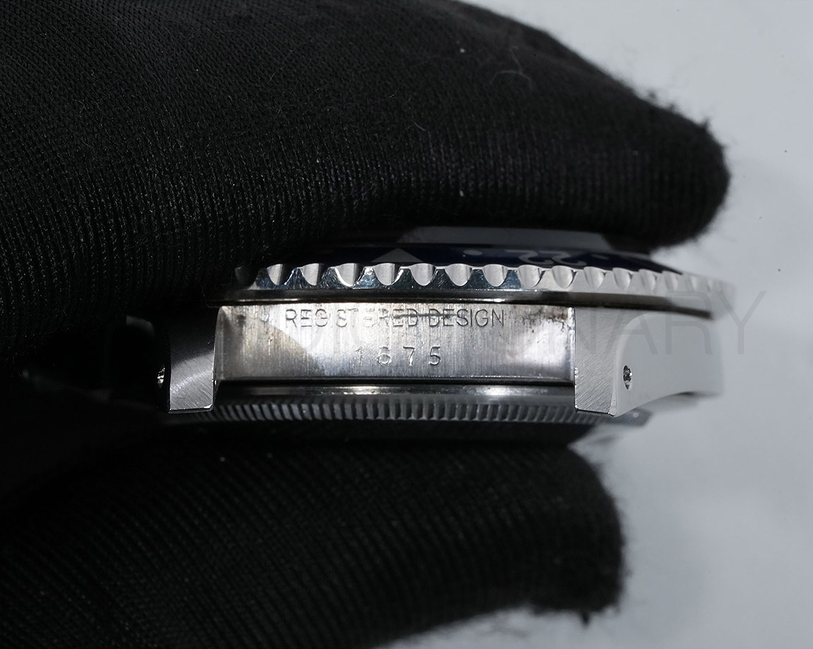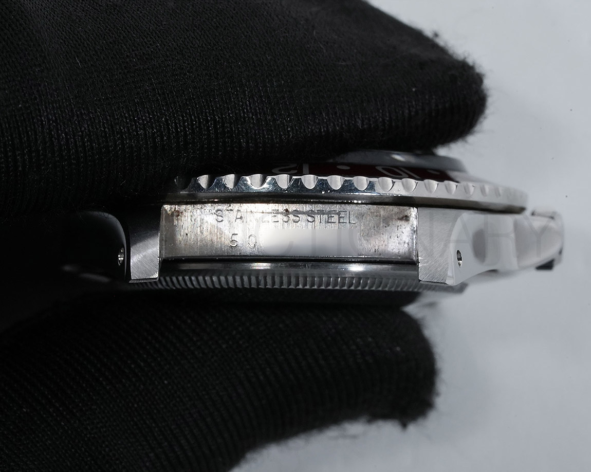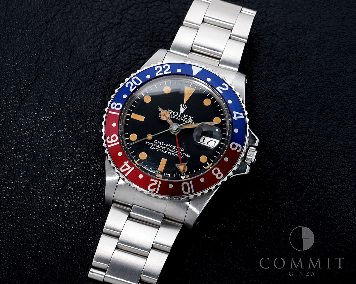 1960年から1980年頃まで製造されたロングセラーモデルのGMTマスター「Ref.1675」。フチなしのインデックスにプラスチック風防を備え、アンティークの雰囲気を存分に楽しむことができるモデルです。