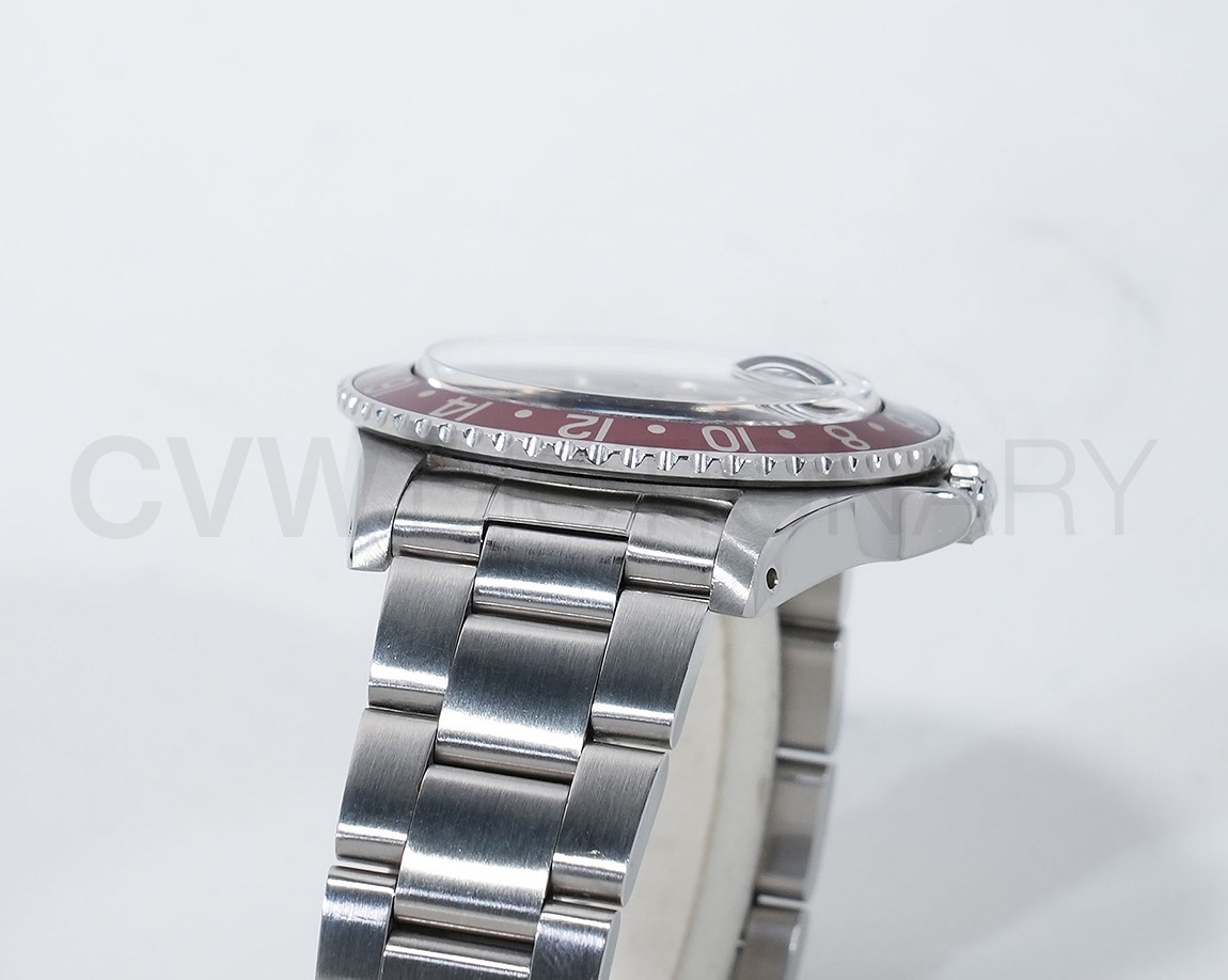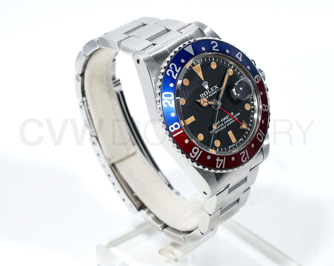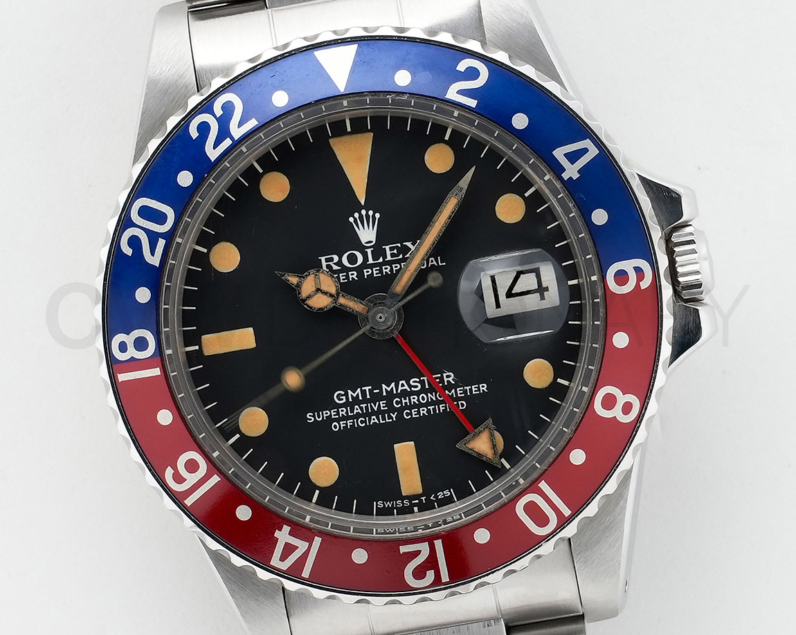 1960年から1980年頃まで製造されたロングセラーモデルのGMTマスター「Ref.1675」。フチなしのインデックスにプラスチック風防を備え、アンティークの雰囲気を存分に楽しむことができるモデルです。