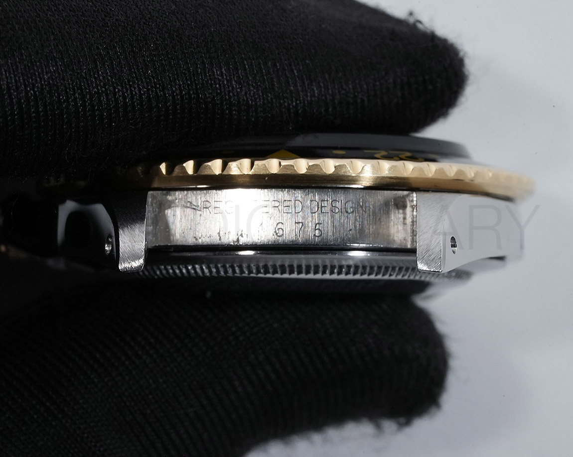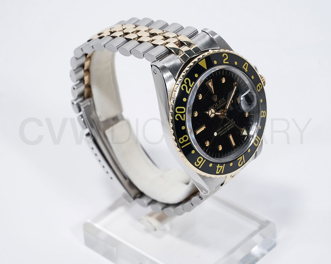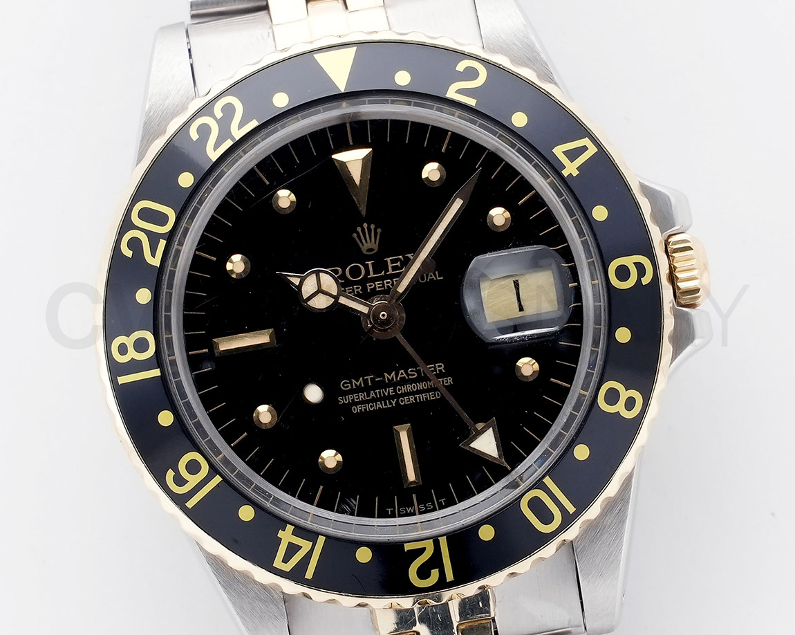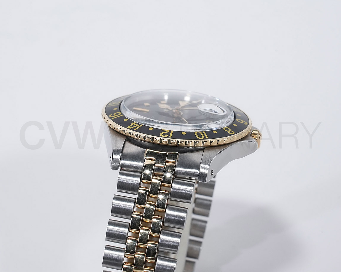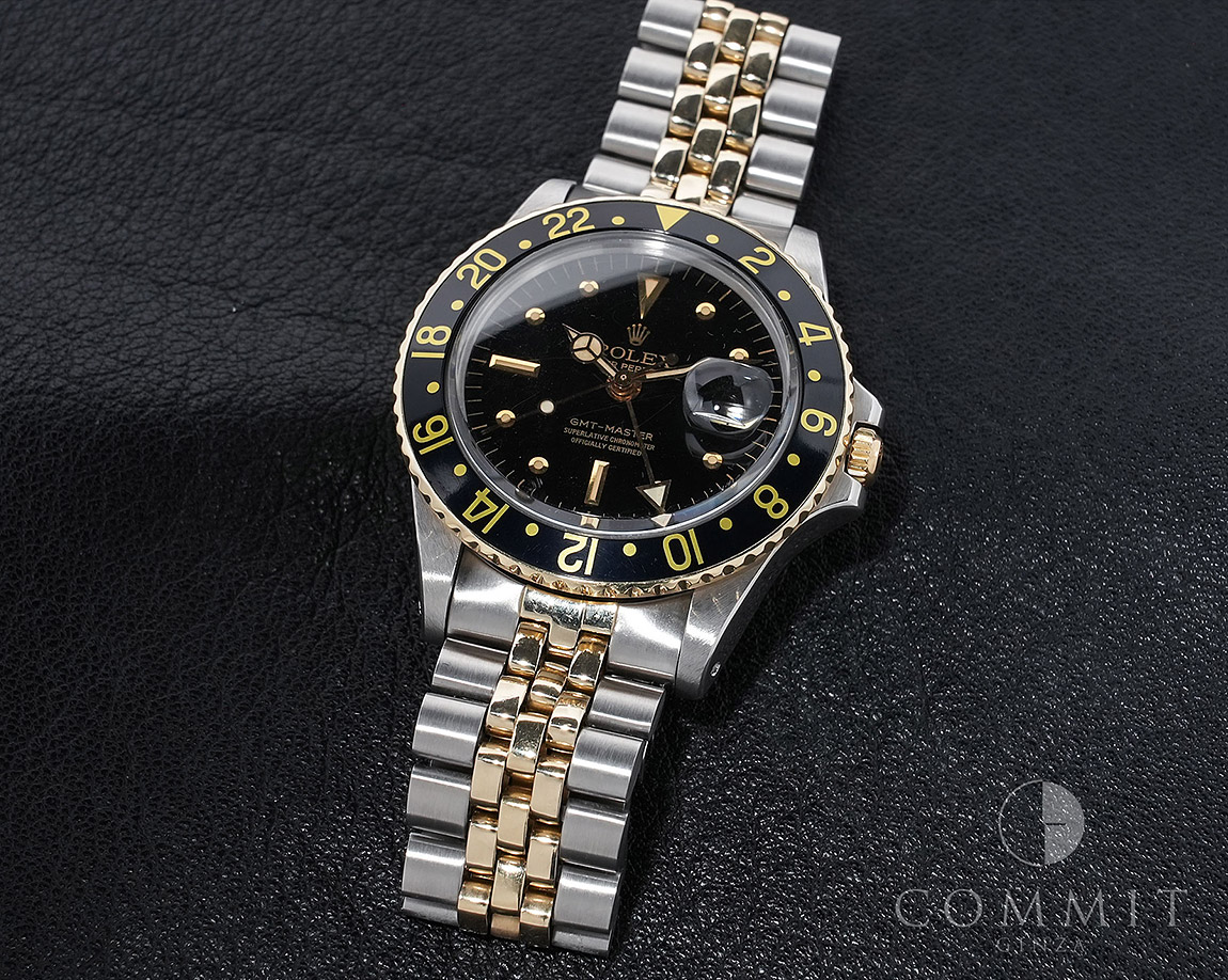1960年代後半から追加された『GMTマスター』初のSS/YGのコンビモデル「Ref.1675/3」。プラスチック風防を備え、インデックスがアップライト仕様で人気の通称「フジツボダイヤル」が採用されています。アンティークの雰囲気を存分に楽しむことができるモデルです。