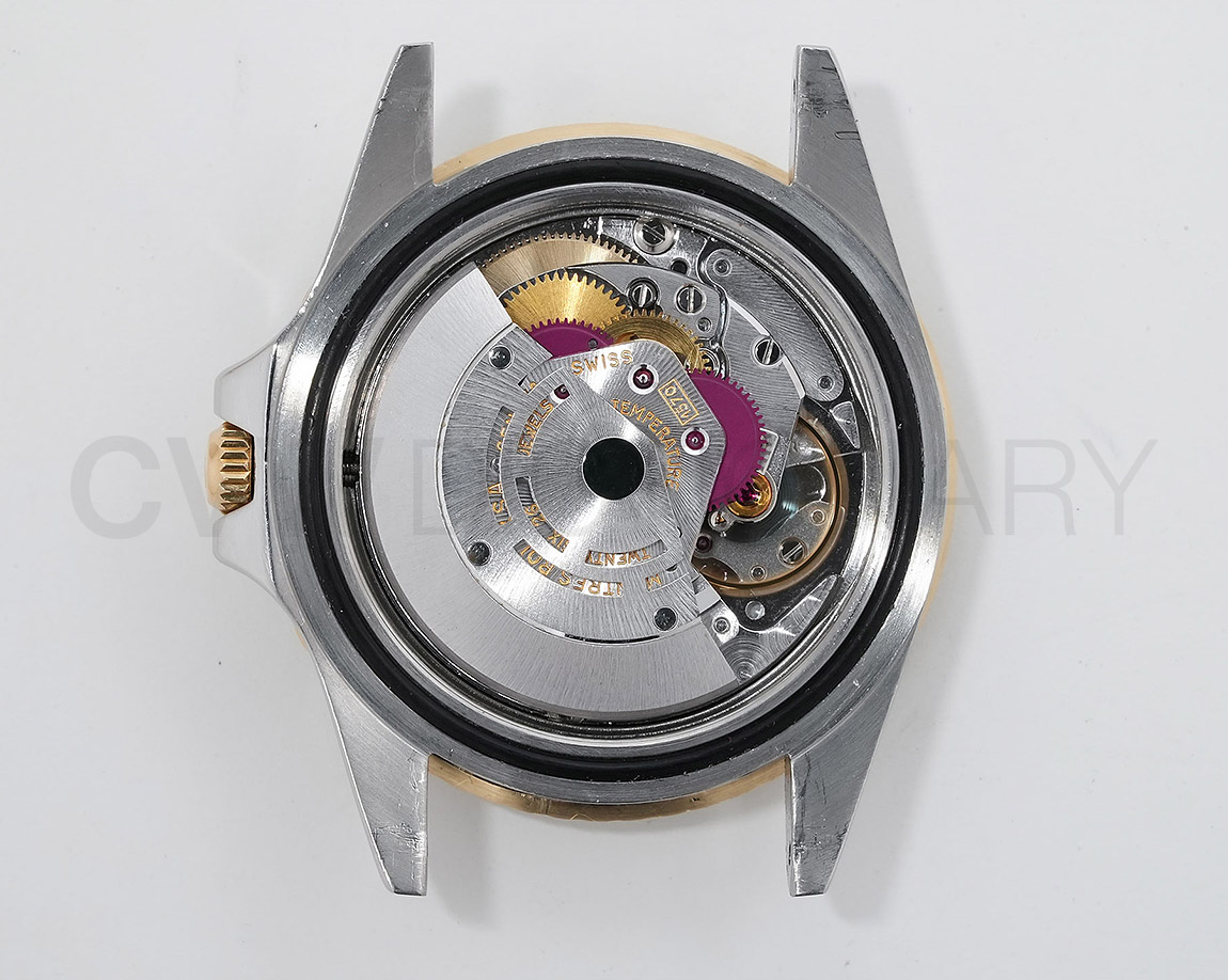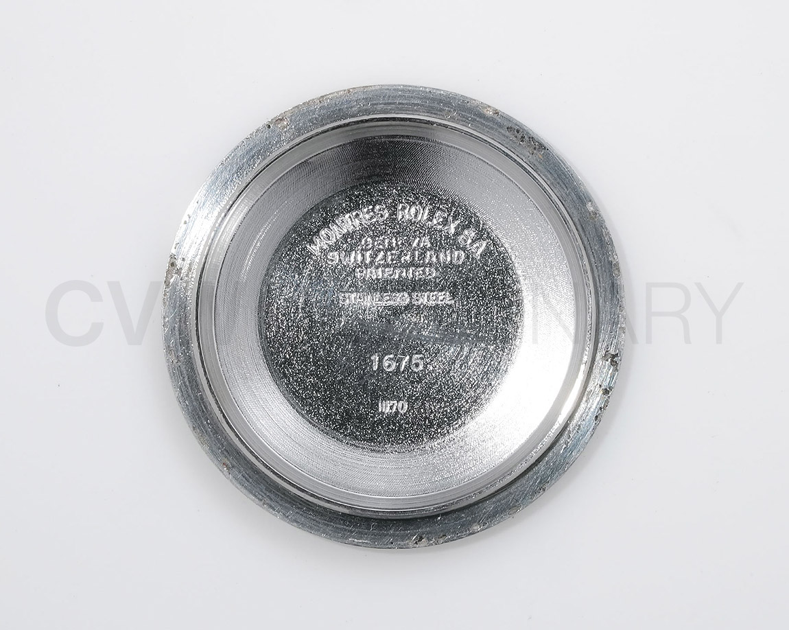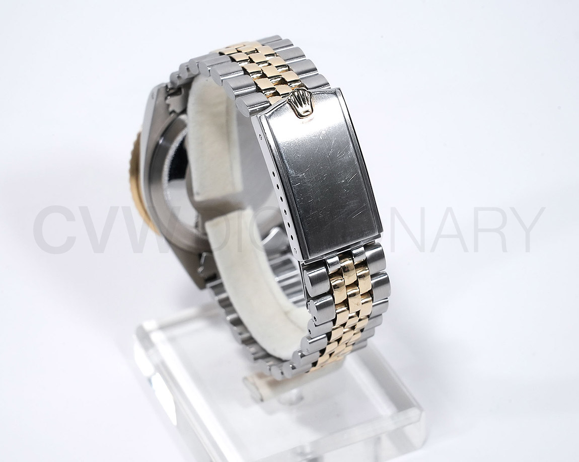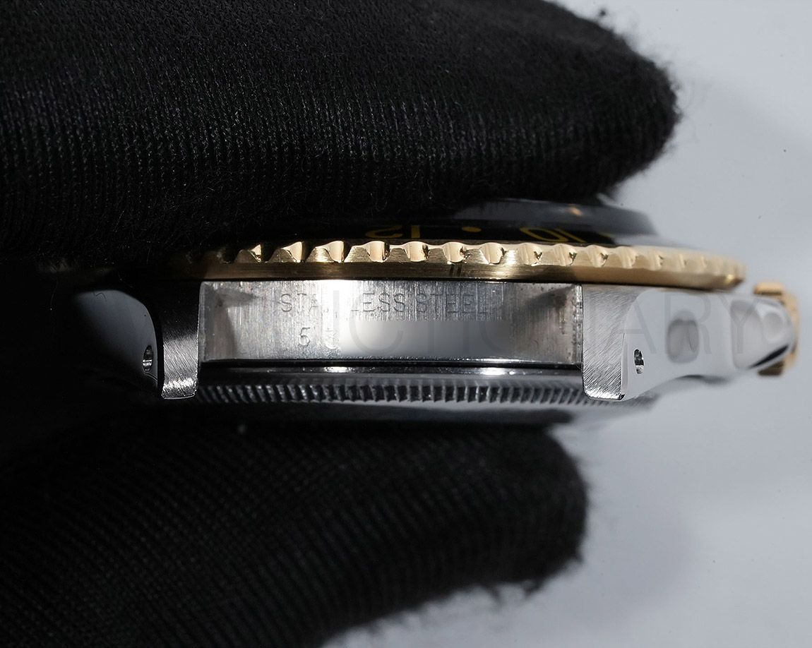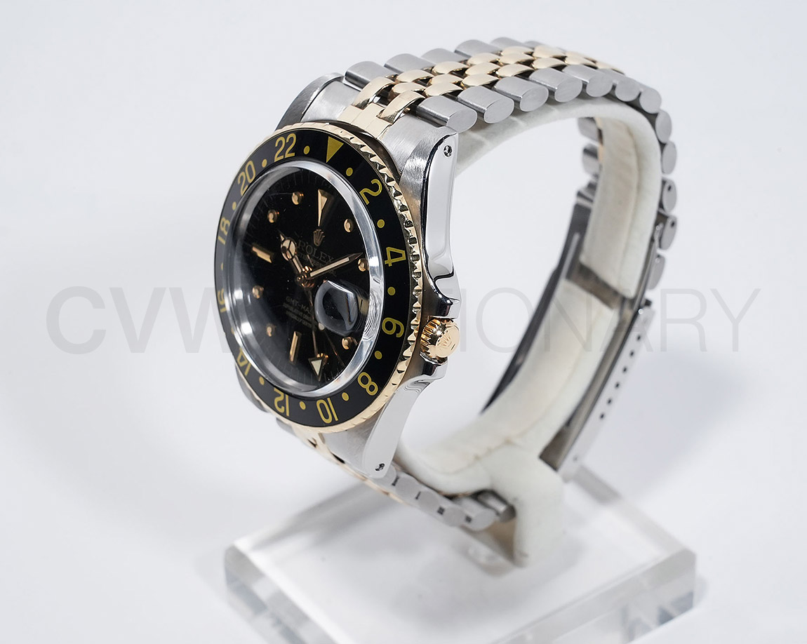 1960年代後半から追加された『GMTマスター』初のSS/YGのコンビモデル「Ref.1675/3」。プラスチック風防を備え、インデックスがアップライト仕様で人気の通称「フジツボダイヤル」が採用されています。アンティークの雰囲気を存分に楽しむことができるモデルです。