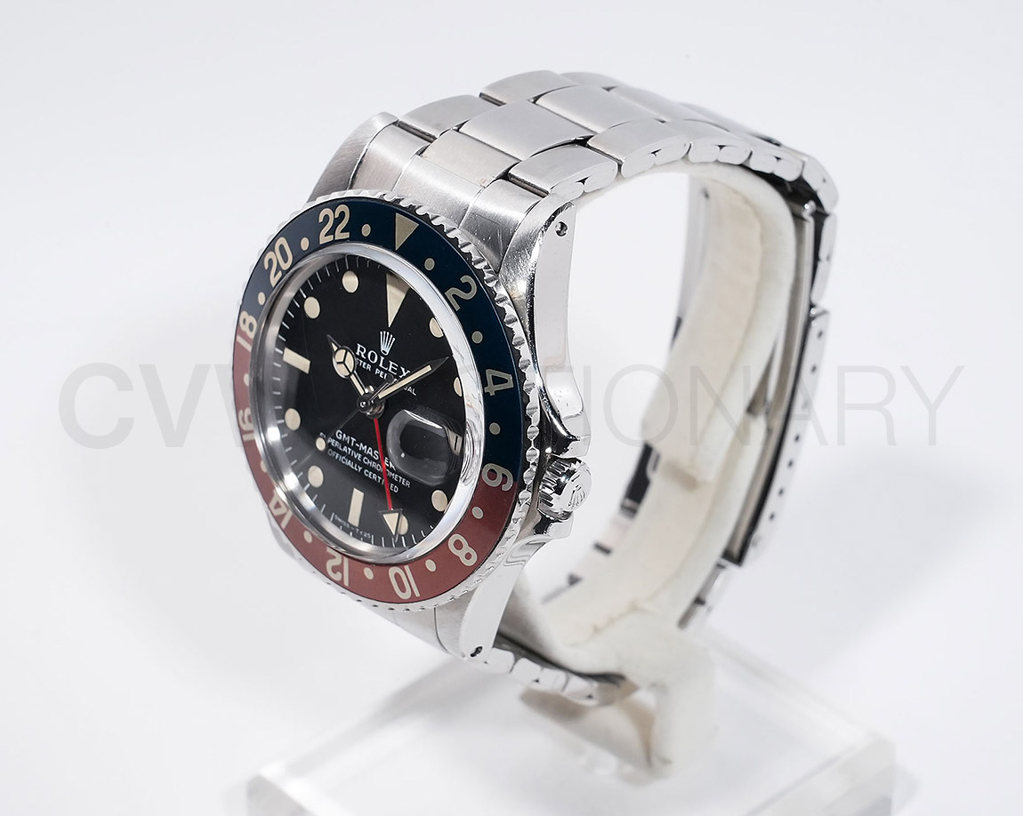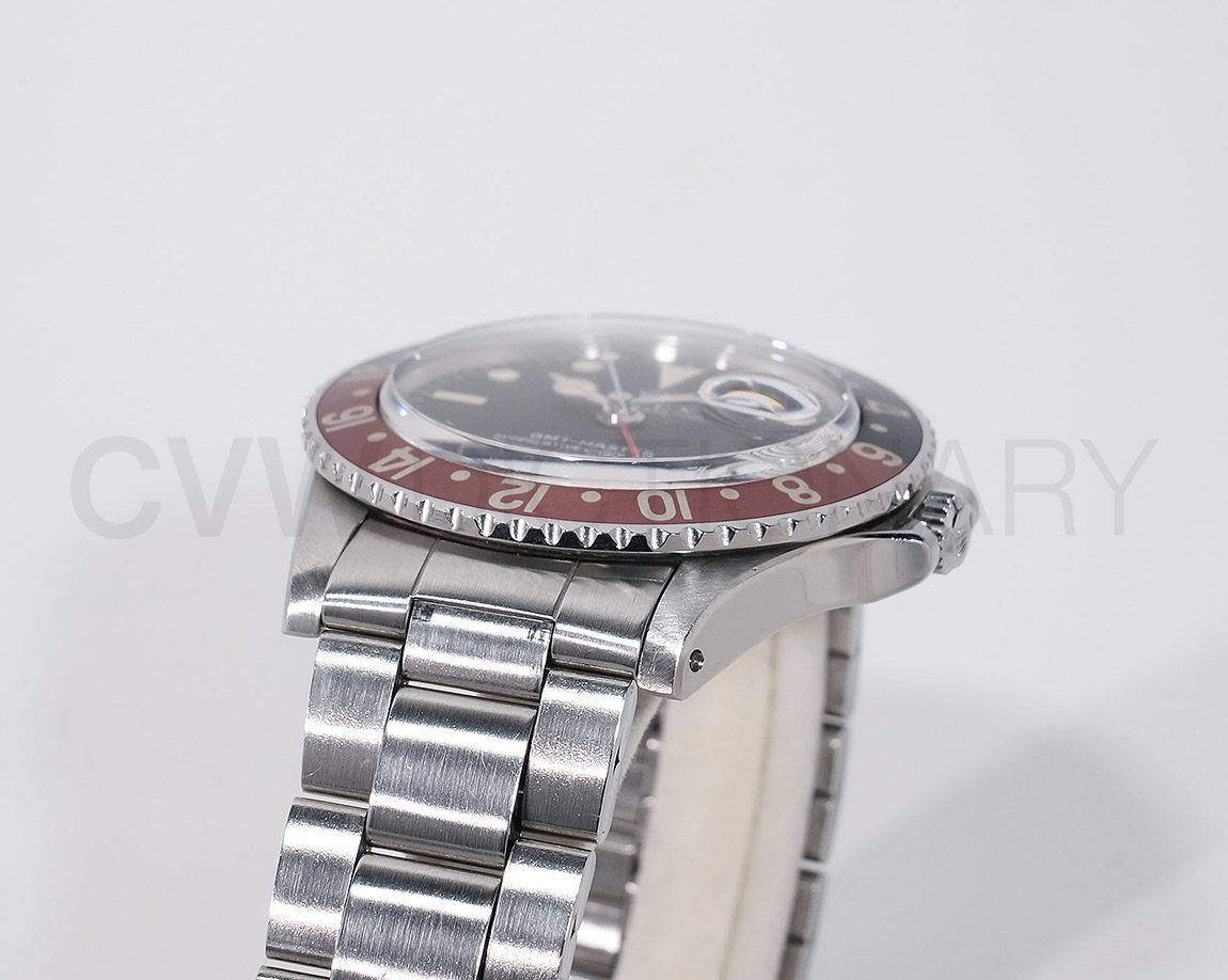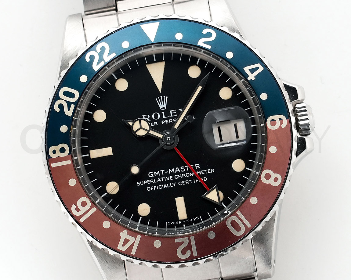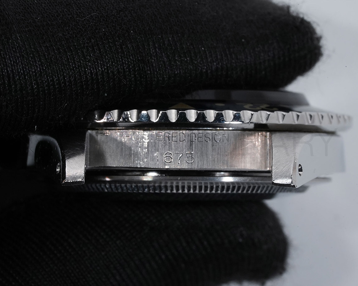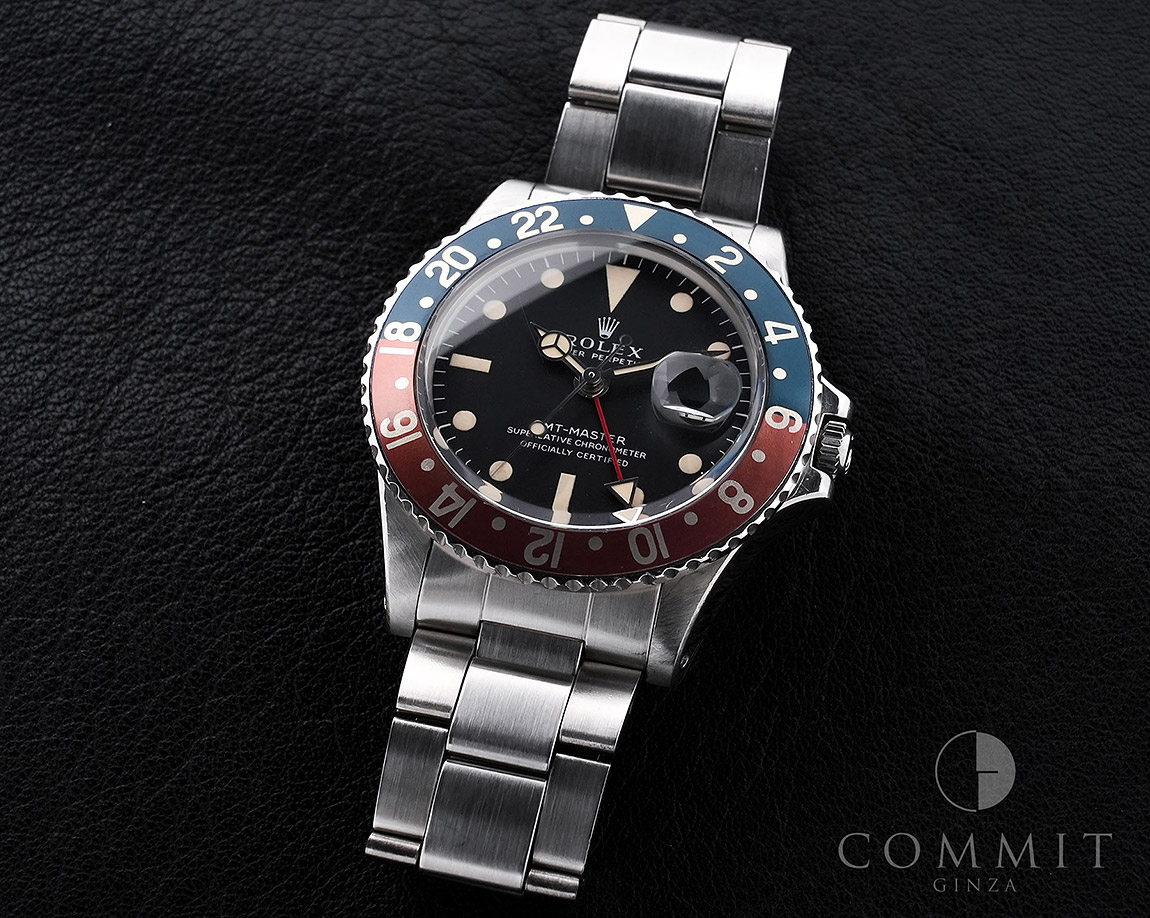 1960年から1980年頃まで製造されたロングセラーモデルのGMTマスター「Ref.1675」。フチなしのインデックスにプラスチック風防を備え、アンティークの雰囲気を存分に楽しむことができるモデルです。