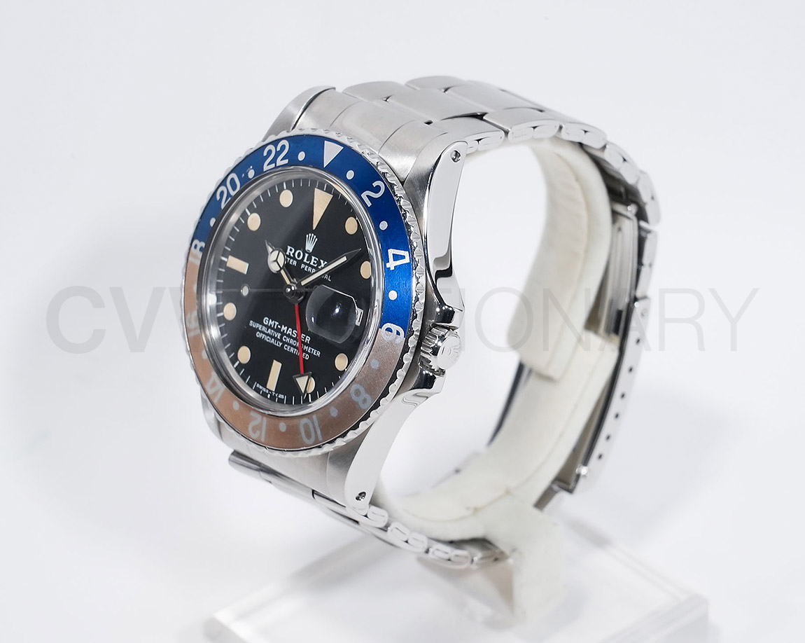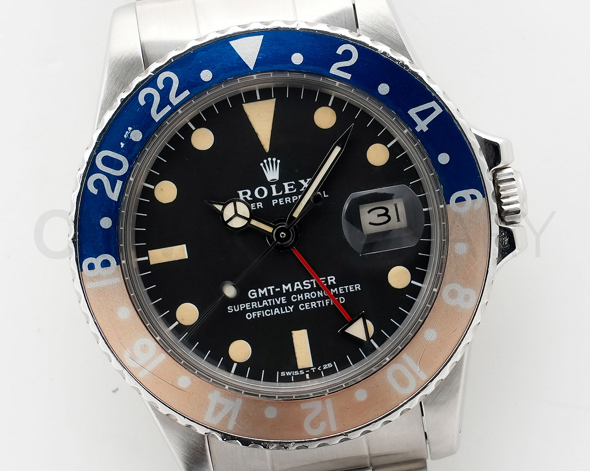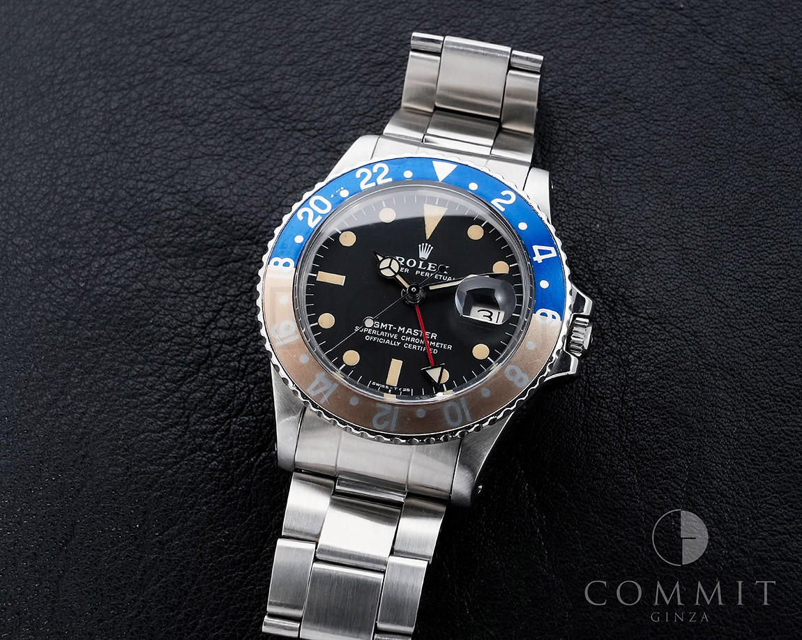 1960年から1980年頃まで製造されたロングセラーモデルのGMTマスター「Ref.1675」。フチなしのインデックスにプラスチック風防を備え、アンティークの雰囲気を存分に楽しむことができるモデルです。