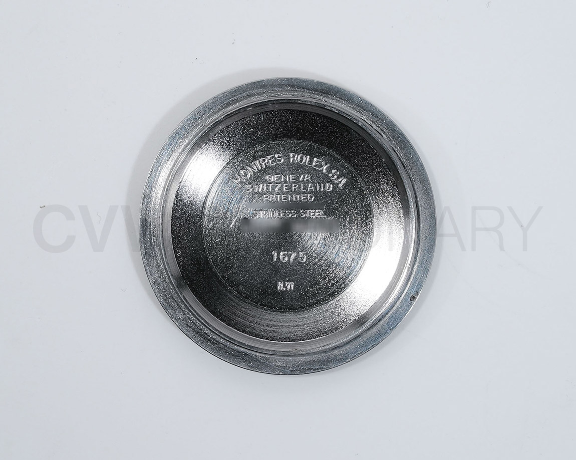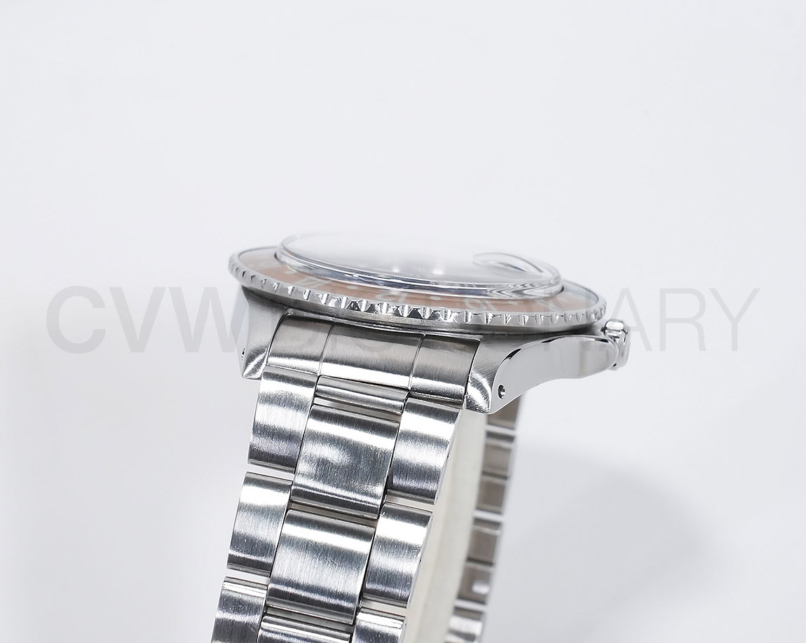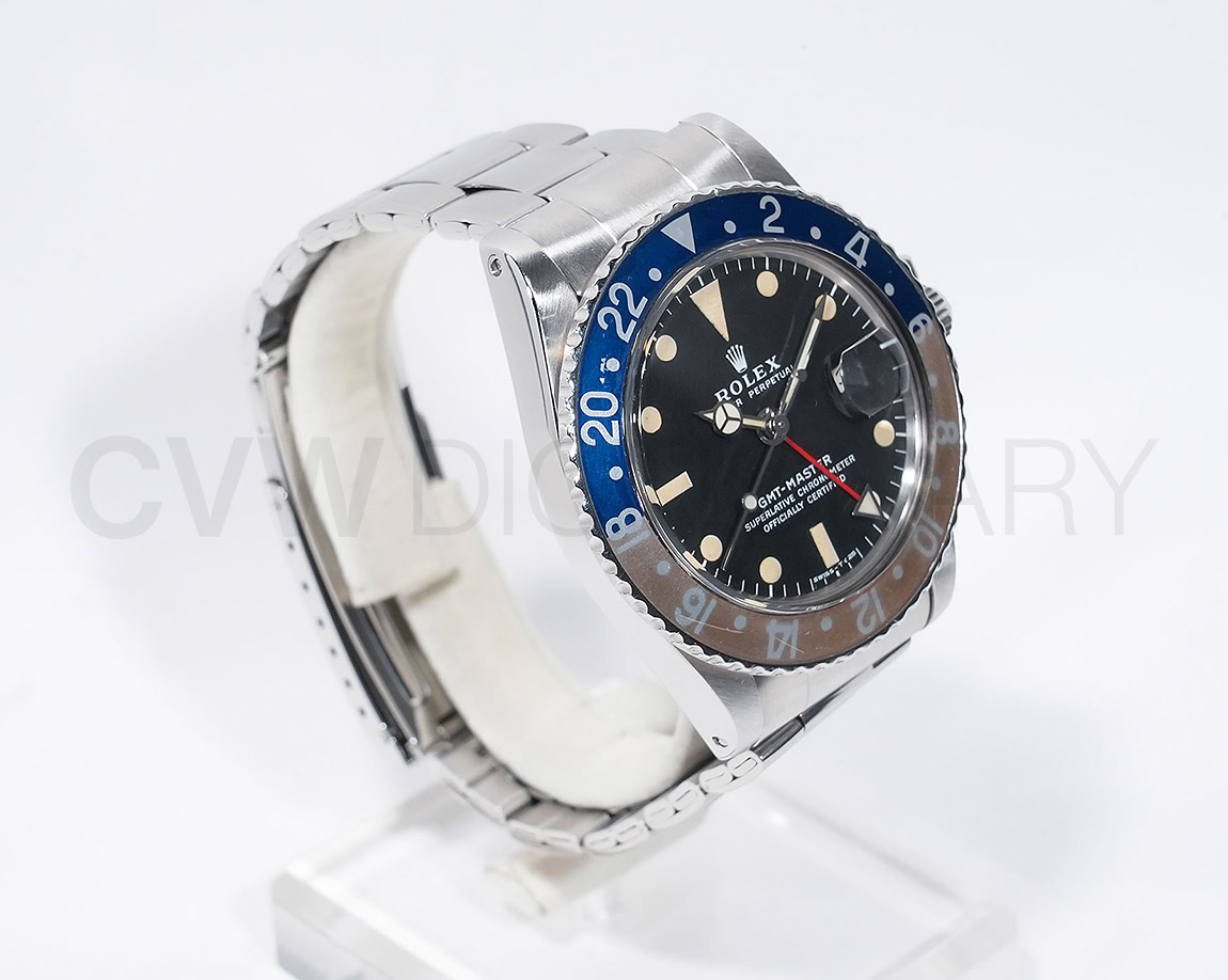 1960年から1980年頃まで製造されたロングセラーモデルのGMTマスター「Ref.1675」。フチなしのインデックスにプラスチック風防を備え、アンティークの雰囲気を存分に楽しむことができるモデルです。