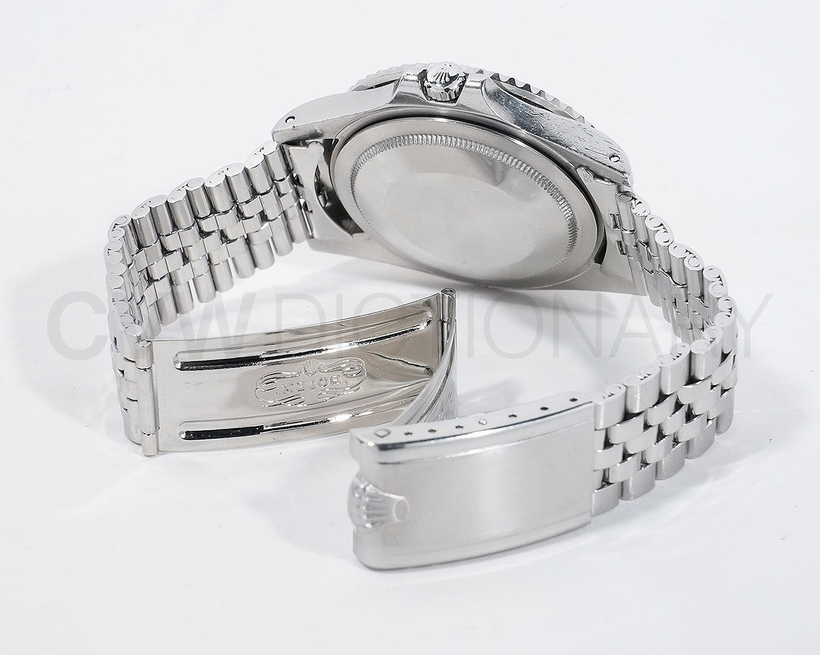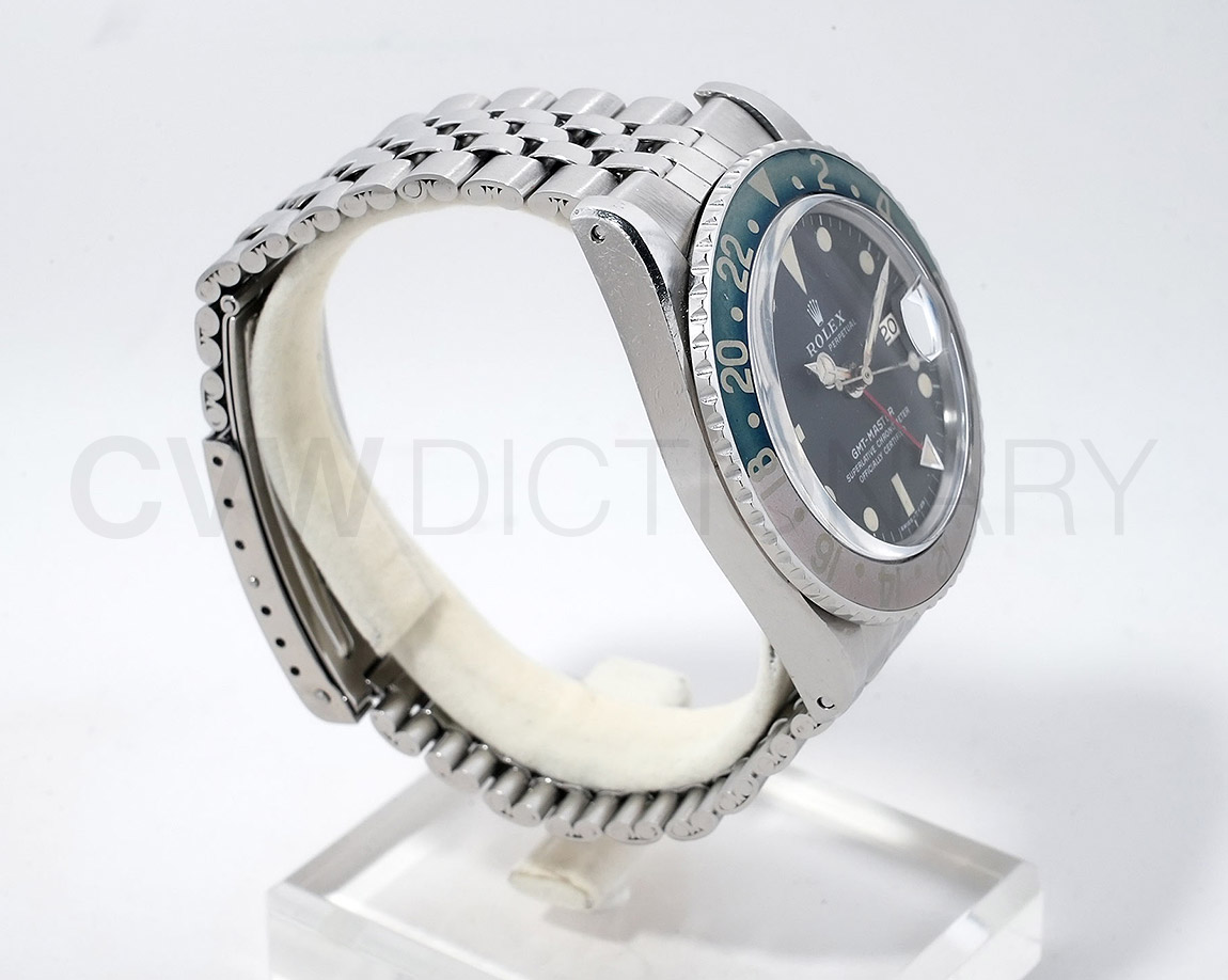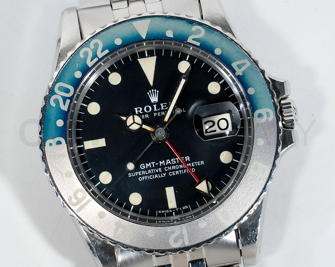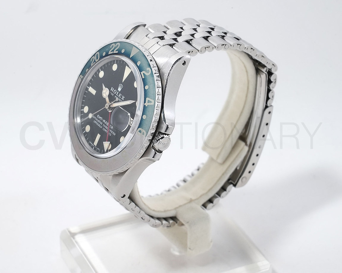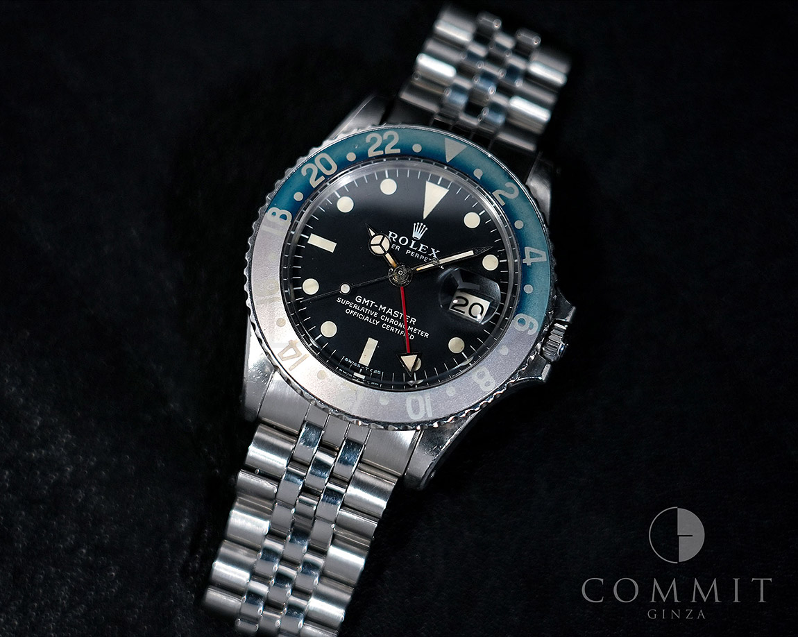 1960年から1980年頃まで製造されたロングセラーモデルのGMTマスター「Ref.1675」。フチなしのインデックスにプラスチック風防を備え、アンティークの雰囲気を存分に楽しむことができるモデルです。