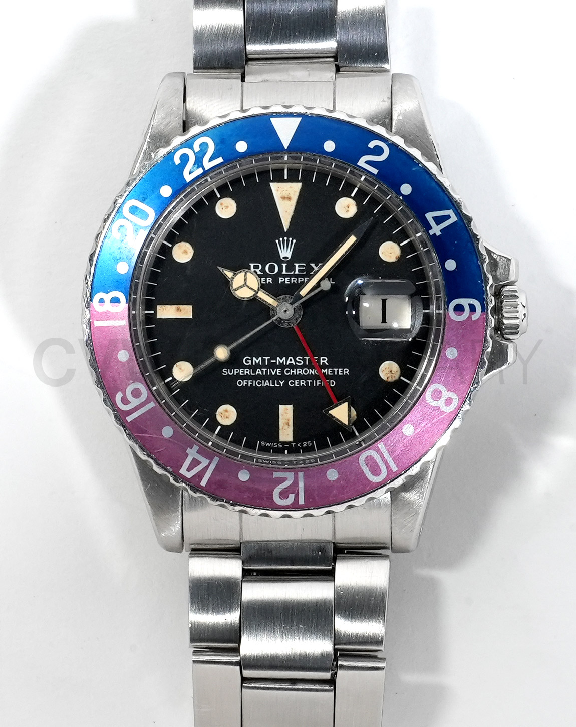 1960年から1980年頃まで製造されたロングセラーモデルのGMTマスター「Ref.1675」。フチなしのインデックスにプラスチック風防を備え、アンティークの雰囲気を存分に楽しむことができるモデルです。