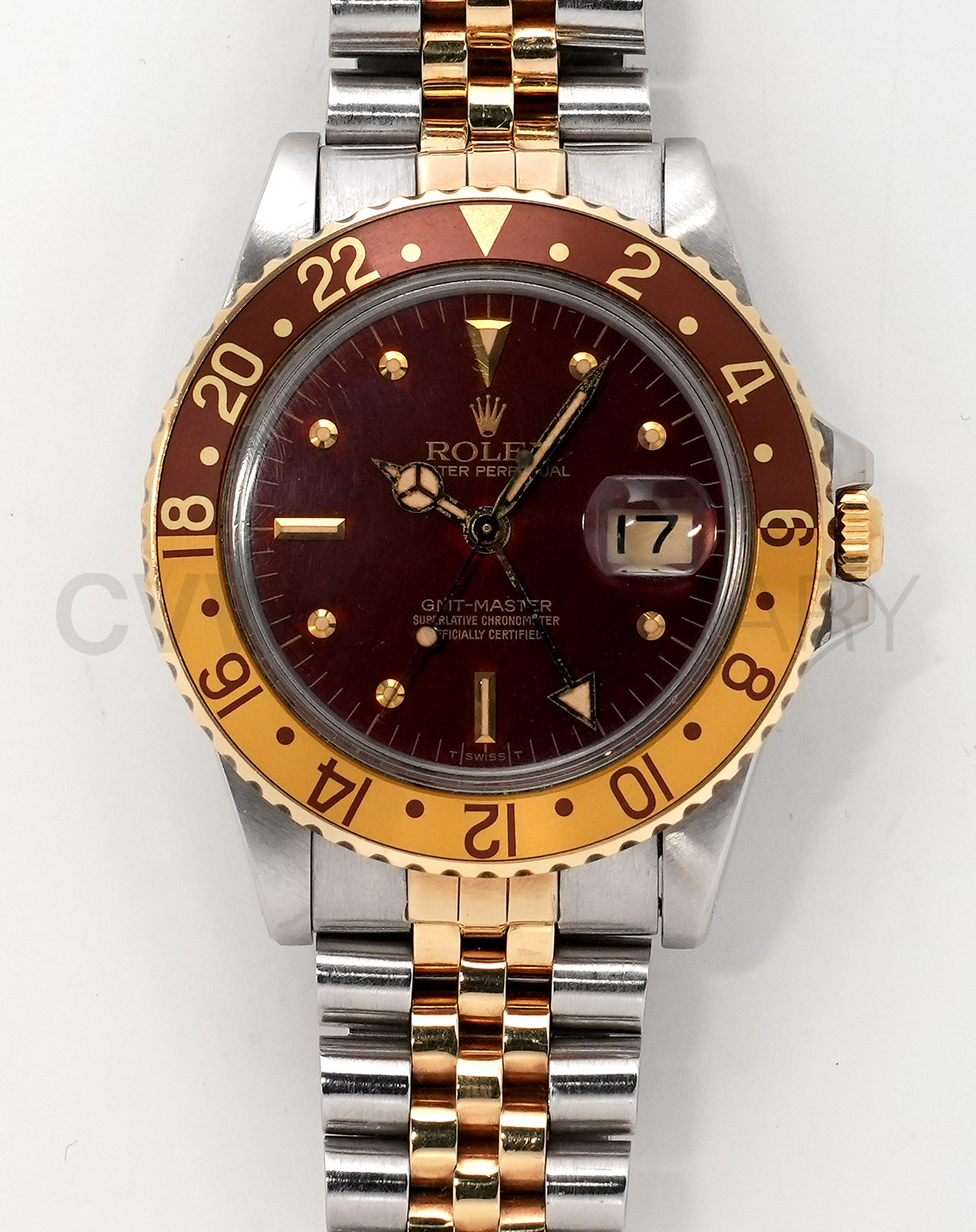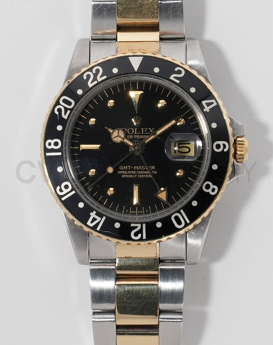 1960年から1980年頃まで製造されたロングセラーモデルのGMTマスター「Ref.1675」。フチなしのインデックスにプラスチック風防を備え、アンティークの雰囲気を存分に楽しむことができるモデルです。