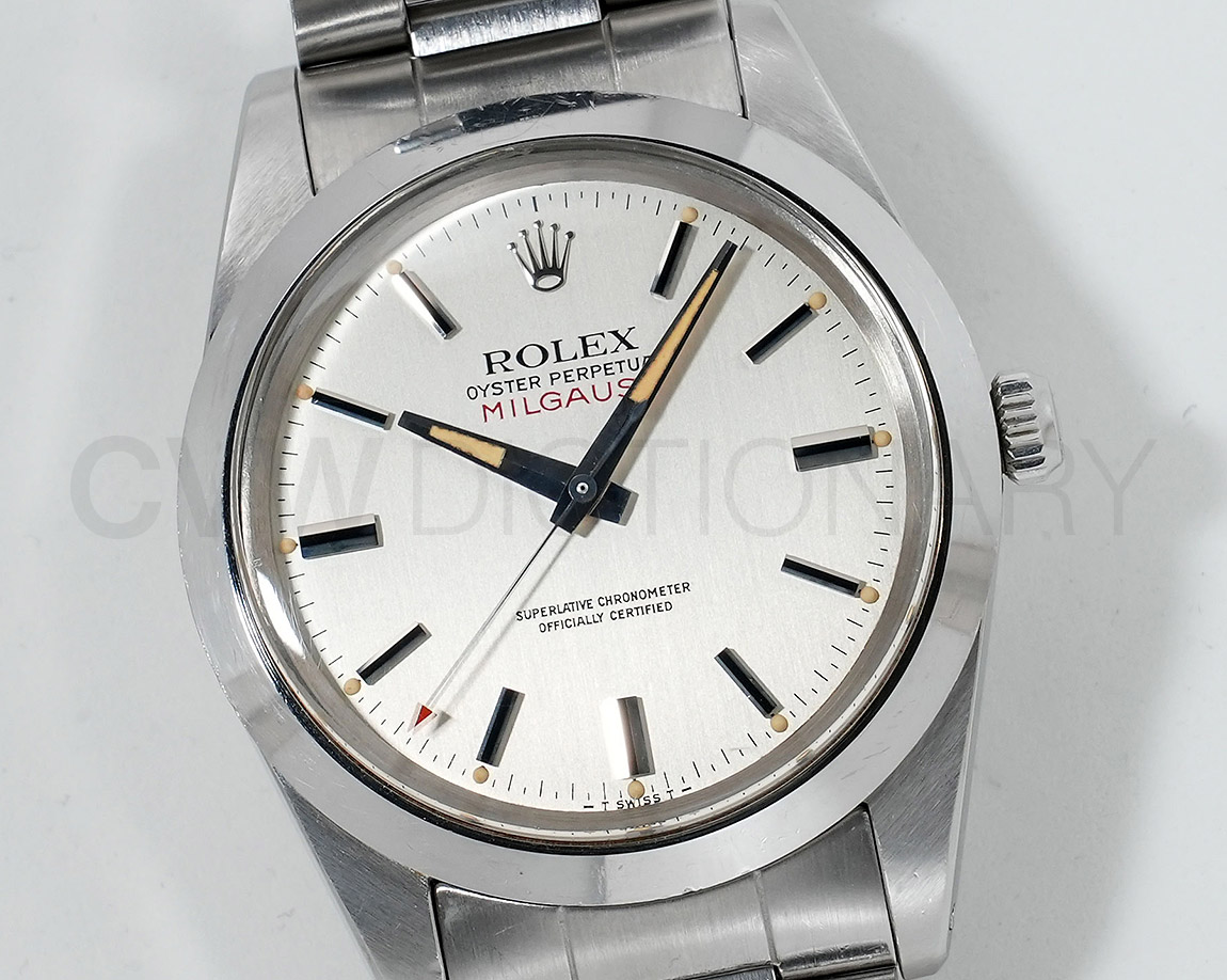 1960年代前半に製造されていた、大ぶりでシンプルなデザインの2代目ミルガウス。モデル名の表記と秒針の先が赤色でカラーリングされているのが特徴で、シンプルな文字盤上で良く映えます。ファーストモデルとは全く違った視認性の高いデザインに変更されたのが特徴です。