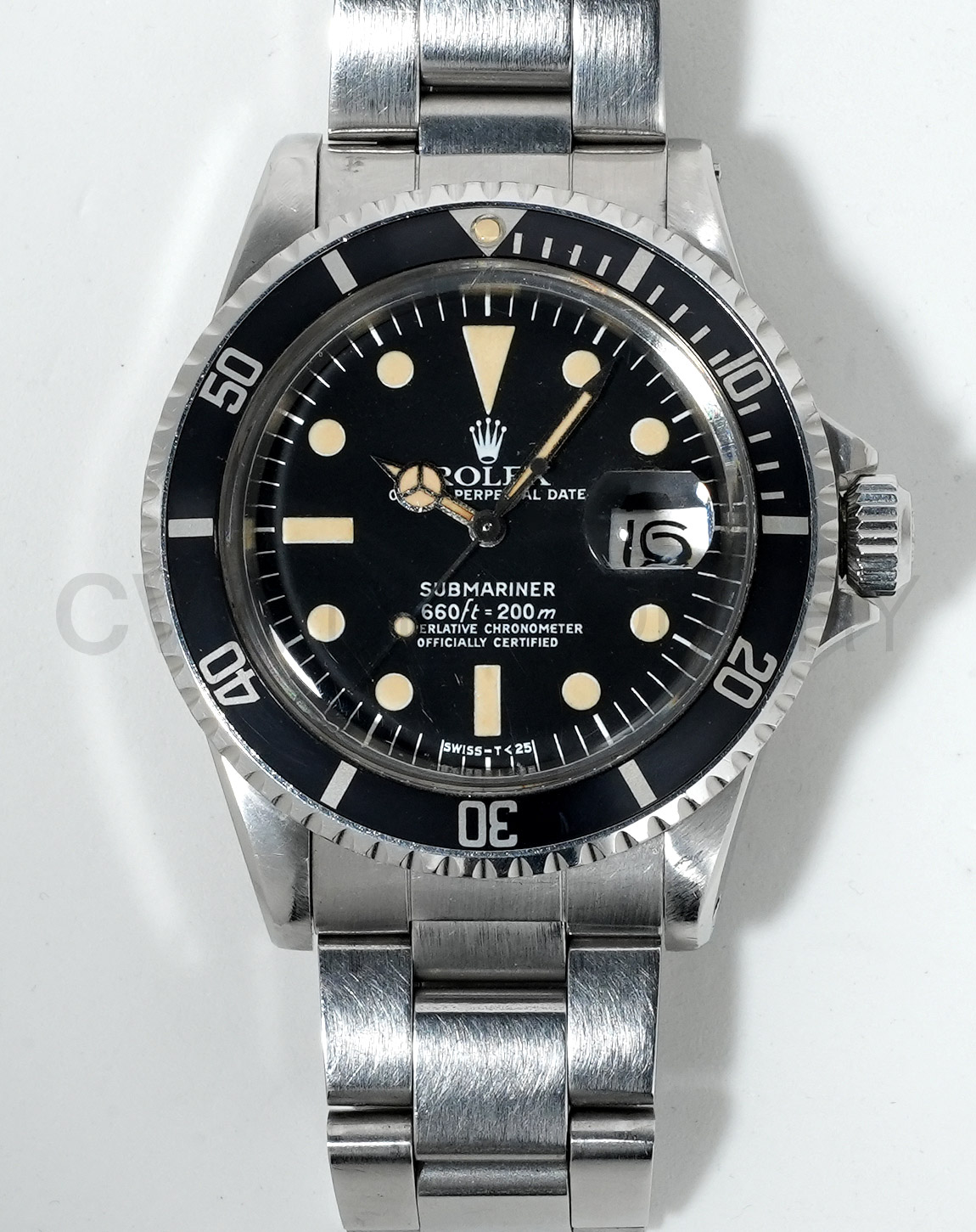 仕様に伴うスレキズがございますが、ケースがしっかりとした良個体です。文字盤は経年劣化により全体にクラックが入った「スパイダーダイヤル」でございます。ケースコンディションが非常に良くヘアライン・エッジライン共にしっかり残っており、エッジが立った極太ケースとなっております。